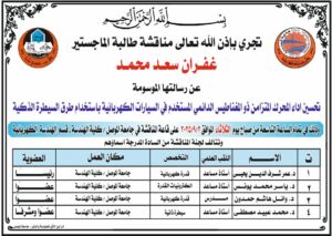 ناقشت كلية الهندسة / قسم الهندسة الكهربائية بجامعة الموصل رسالة ماجستير عن تحسين اداء المحرك المتزامن ذو المغناطيس الدائمي المستخدم في السيارات الكهربائية باستخدام طرق السيطرة الذكية، يوم الثلاثاء الموافق 2 ايلول 2025 .