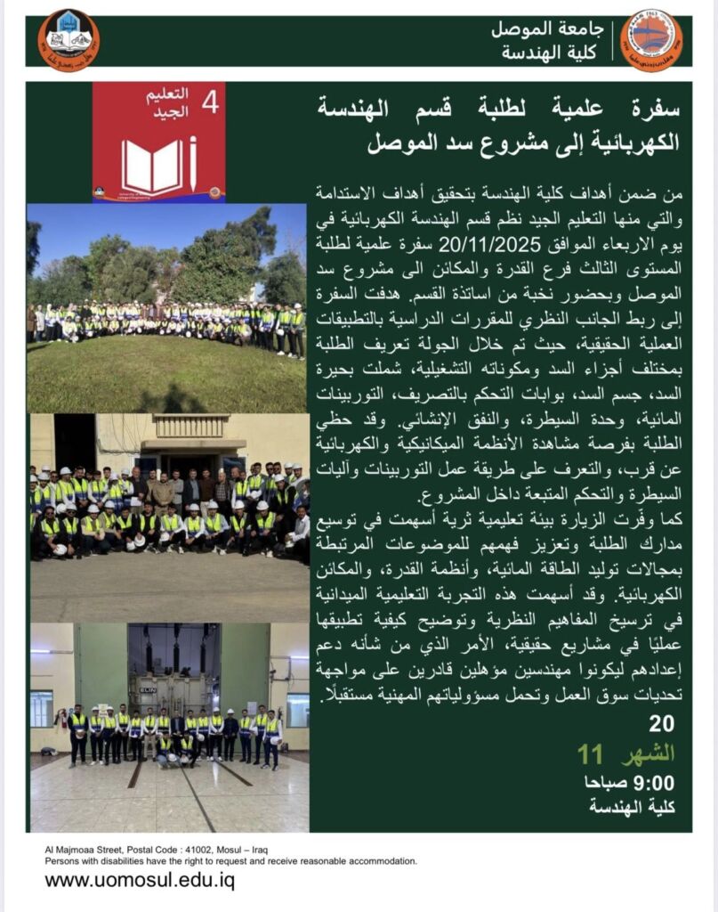 ضمن النشاطات العلمية لكلية الهندسة بجامعة الموصل و سعيها لتحقيق أهداف التنمية المستدامة، لا سيما الهدف الرابع (التعليم الجيد)، أقامت شعبة الارشاد النفسي الجامعي في كلية الهندسة وبالتعاون مع قسم الارشاد النفسي الجامعي وقسم الدراسات والتخطيط/ وحدة التنمية المستدامة في رئاسة جامعة الموصل دورة تدريبية بعنوان (دور الإرشاد الأكاديمي والدعم النفسي في إنجاح مشاريع التخرج) للفترة من 16 تشرين الثاني ولغاية 20 تشرين الثاني 2025 في قاعة المناقشات لقسم هندسة الحاسوب. الدورة موجهة لطلبة المرحلة المنتهية في الدراسات الأولية.