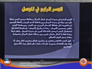 في اطار التعاون بين جامعة الموصل/كلية الهندسة والمؤسسات التنفيذية في محافظة نينوى ومن اجل نقل الخبرات العملية لتنفيذ المشاريع الاستراتيجية إلى الخريجين وطلبة الدراسات العليا وتبادل الخبرات مع الكادر الاكاديمي لربط الجانب المعرفي بالجانب التطبيقي ، وبحضور السيد عميد كلية الهندسة الاستاذ المساعد الدكتور عمر حمدون محمد والسيد معاون العميد للشؤون العلمية الاستاذ المساعد الدكتور ايمن طالب حميد والسيد رئيس قسم الهندسة المدنية الأستاذ المساعد الدكتور براء جبار محمود، اقام قسم الهندسة المدنية وبالتعاون مع مديرية طرق وجسور نينوى ورشة العمل الموسومة “اعادة تأهيل الجسر الرابع في مدينة الموصل ” في اروقة قسم الهندسة المدنية وعلى قاعة نجيب خروفة اليوم الخميس الموافق 20 تشرين الثاني 2025 وفي تمام الساعة العاشرة صباحا.