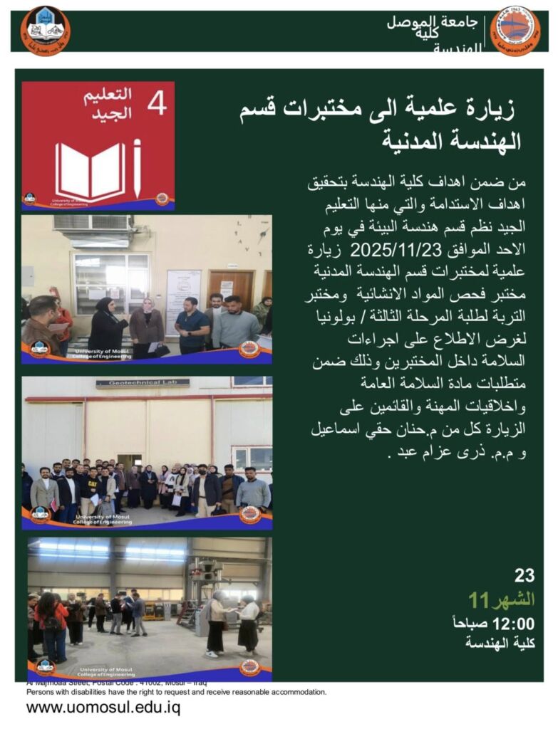 ضمن توجهات كلية الهندسة في جامعة الموصل نحو دعم التحول الرقمي وتطوير بيئة تعليمية رصينة ومواكبة للمستجدات العالمية، وبالتعاون مع قسم الدراسات والتخطيط/ وحدة التنمية المستدامة في رئاسة جامعة الموصل وبما يعزز أهداف التنمية المستدامة الهدف الرابع التعليم الجيد، والهدف التاسع الصناعة والابتكار والهياكل الأساسية، والهدف السابع عشر عقد الشراكات لتحقيق الأهداف، نظّم قسم هندسة الاتصالات والأنظمة الرقمية الذكية ورشة عمل إلكترونية وحضورية بعنوان “توظيف أدوات الذكاء الاصطناعي لتعزيز جودة التعليم والبحث العلمي” يوم الأحد الموافق 23/11/2025 في قاعة زها حديد – قسم هندسة العمارة، بحضور وإشراف رئيس القسم الأستاذ المساعد الدكتور محمد طارق ياسين، وبحضور عدد من تدريسي كلية الهندسة، وطلبة الدراسات العليا والأولية.