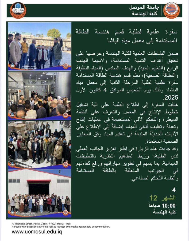 ضمن النشاطات العلمية لكلية الهندسة، وبهدف تعزيز جهودها في تحقيق أهداف التنمية المستدامة ولا سيما الهدف الرابع “التعليم الجيد”، أقام قسم الهندسة الميكانيكية بالتعاون مع شعبة الإرشاد النفسي في كلية الهندسة وقسم الإرشاد النفسي الجامعي وقسم الدراسات والتخطيط / وحدة التنمية المستدامة في رئاسة جامعة الموصل ورشة عمل بعنوان “طرائق التدريس الحديثة”، وذلك يوم الأحد الموافق 7/12/2025 على قاعة المناقشة في الكلية.