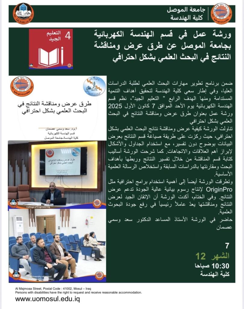 ورشة عمل في قسم الهندسة الكهربائية بجامعة الموصل عن طرق عرض ومناقشة النتائج في البحث العلمي بشكل احترافي