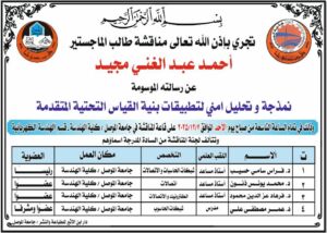 ترأس لجنة المناقشة الأستاذ المساعد الدكتور فراس سامي حسيب وعضوية كلا من الأستاذ المساعد الدكتور محمد يونس ذنون، الأستاذ المساعد الدكتور فرهاد عز الدين محمود وبإشراف وعضوية المدرس الدكتور عمر مصطفى علي.