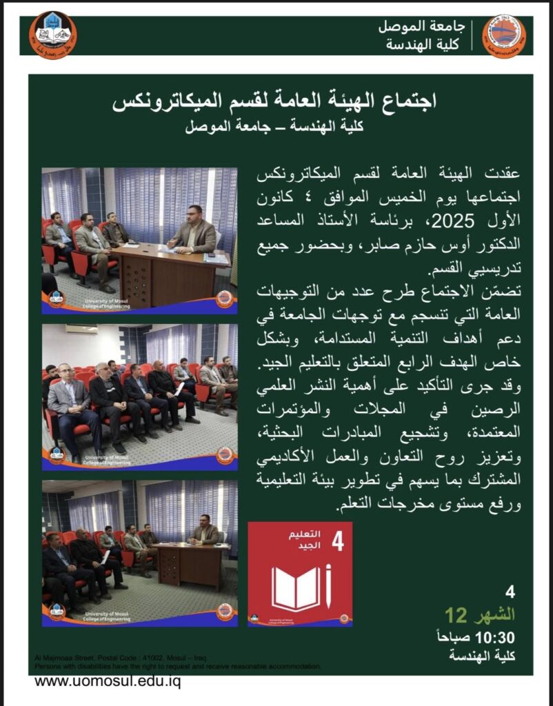 ضمن برنامج تطوير مهارات البحث العلمي لطلبة الدراسات العليا، وفي إطار سعي كلية الهندسة لتحقيق أهداف التنمية المستدامة ومنها الهدف الرابع ” التعليم الجيد”، نظم قسم الهندسة الكهربائية يوم الأحد الموافق 7 كانون الأول 2025 ورشة عمل بعنوان طرق عرض ومناقشة النتائج في البحث العلمي بشكل احترافي