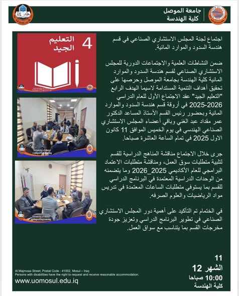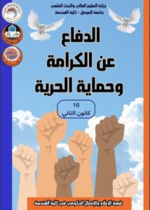 برعاية السيد رئيس جامعة الموصل الأستاذ الدكتور وحيد محمود الإبراهيمي، وبإشراف السيد عميد كلية الهندسة الأستاذ المساعد الدكتور عمر محمد حمدون، وفي إطار السعي المستمر لتعزيز الوعي بثقافة حقوق الإنسان، وتحقيقا لاهداف التنمية المستدامة ومنها الهدف الرابع ( التعليم الحيد) والهدف الخامس(المساواه بين الجنسين) والهدف العاشر (الحد من اوجع عدم المساواة) والهدف السادس عشر (السلام والعدل والمؤسسات القوية) , نظّمت شعبة الإعلام والاتصال الحكومي بالتعاون مع وحدة حقوق الإنسان وشعبة الارشاد النفسي الجامعي وشعبة النشاطات الطلابية في كليتنا و(رئاسة الجامعة) قسم الدراسات والتخطيط/ وحدة التنمية المستدامة حملة توعوية بعنوان “اليوم العالمي لحقوق الانسان”، وذلك يوم الخميس الموافق11كانو الاول 2025.
