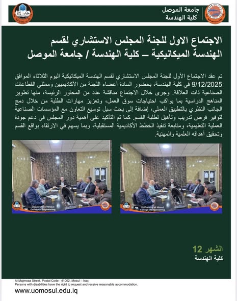 ضمن حرص قسم هندسة الاتصالات والأنظمة الرقمية الذكية في كلية الهندسة – جامعة الموصل على تعزيز جودة التعليم وتطوير البيئة الأكاديمية بما ينسجم مع التوجهات الحديثة في دعم المهارات الرقمية والابتكارية، عقدت لجنة الإرشاد التربوي اجتماعها الدوري مع طلبة المرحلة الأولى يوم 9 كانون الأول 2025.