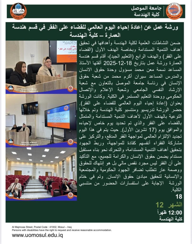 ضمن النشاطات الثقافية لكلية الهندسة بجامعة الموصل، وفي إطار سعيها لتحقيق أهداف التنمية المستدامة، ولا سيما الهدف الرابع “ التعليم الجيد“ وبالتعاون مع (رئاسة جامعة الموصل) قسم الدراسات والتخطيط – وحدة التنمية المستدامة، شاركت وحدة النشاطات الثقافية في كلية الهندسة في اليوم العالمي للغة العربية الذي نظمته جامعة الموصل يوم الخميس الموافق 18كانون الاول 2025 في قاعة المسرح الكبير (قاعة الدكتور محمود الجليلي) في تمام الساعة العاشرة صباحا.