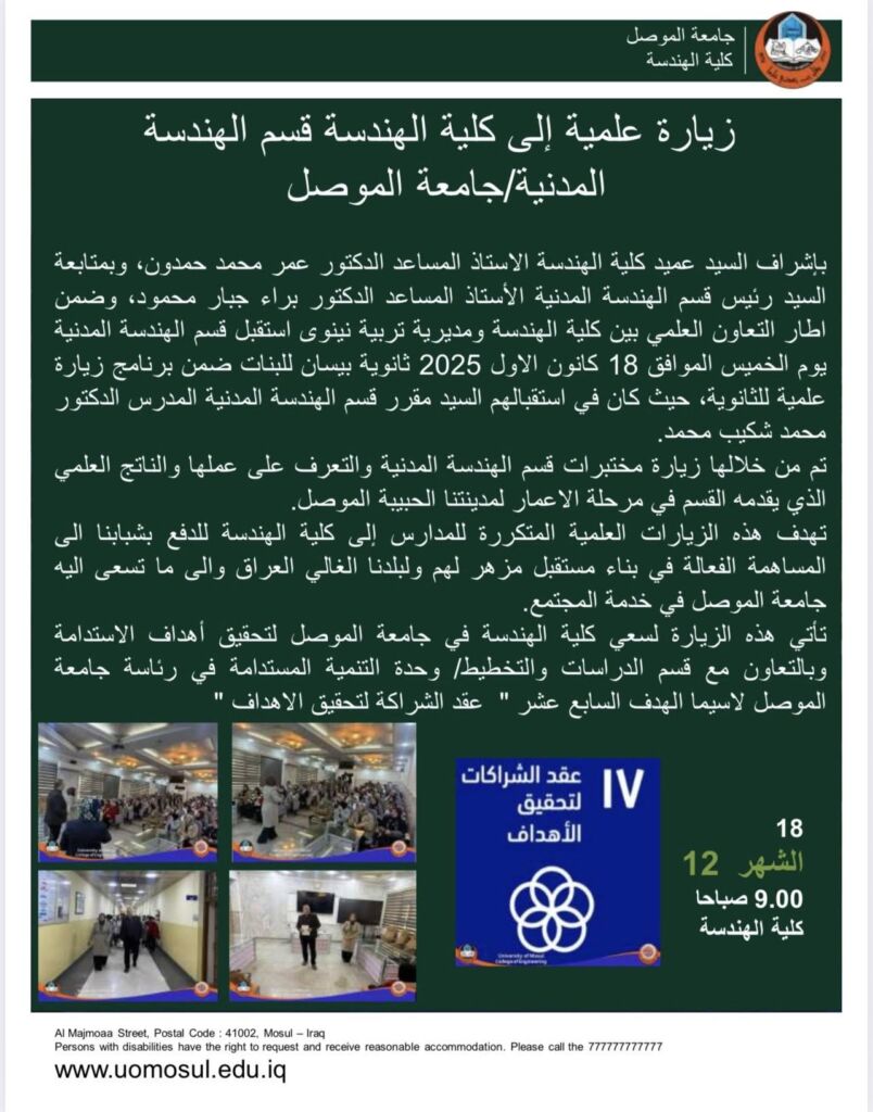 وتؤكد كلية الهندسة من خلال مشاركتها الفاعلة حرصها الدائم على الإسهام في الأنشطة المجتمعية الهادفة، وانسجامها مع رؤية جامعة الموصل في الارتقاء بالإنسان والمجتمع معًا، وترسيخ ثقافة العطاء والعمل المشترك بما يخدم الصالح العام.