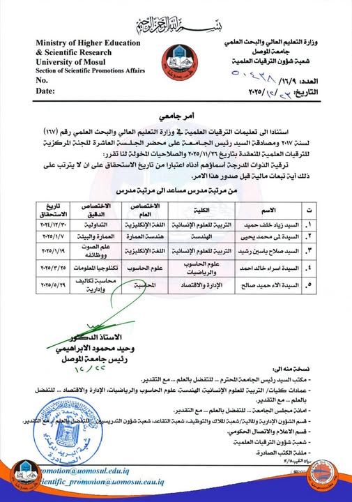 ترقية تدريسي من قسم هندسة العمارة من مرتبة مدرس إلى مرتبة أستاذ مساعد