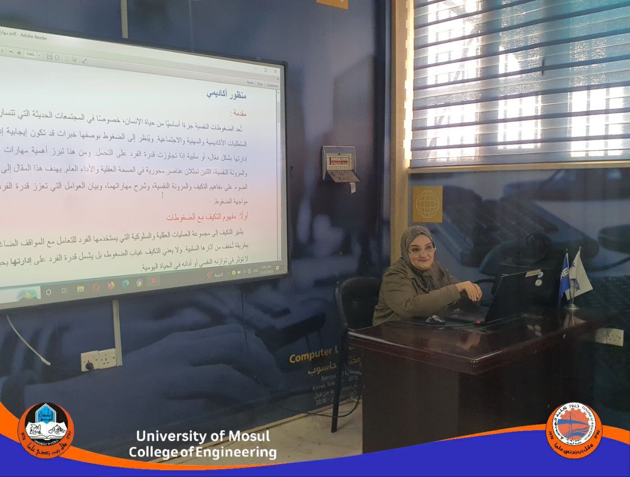 ضمن النشاطات العلمية لكلية الهندسة وسعيها لتحقيق أهداف التنمية المستدامة ، لاسيما الهدف الرابع ( التعليم الجيد ) أقامت شعبة الارشاد النفسي الجامعي في كلية الهندسة وبالتعاون مع قسم الارشاد النفسي الجامعي وقسم الدراسات والتخطيط / وحدة التنمية المستدامة في رئاسة جامعة الموصل دورة تدريبية بعنوان فن التعامل مع الضغوطات وتحويلها الى فرص للنجاح رؤية ارشادية نفسية جامعية في قسم هندسة البيئة للفترة من 21 كانون الاول ولغاية 25 كانون الاول .