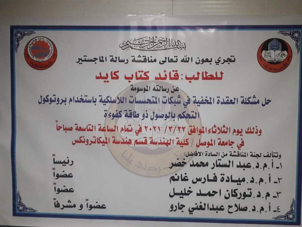 تمت مناقشة رسالة ماجستير في قسم هندسة الحاسوب في كلية الهندسة بجامعة الموصل لطالب الماجستير قائد كتاب كايد تحت عنوان (حل مشكلة العقدة المخفية في شبكات المتحسسات اللاسلكية باستخدام بروتوكول التحكم بالوصول ذي طاقة كفوءة) في التاسعة صباحاً من يوم الثلاثاء الموافق ٢٠٢١/٣/٢٣ في قاعة مناقشات قسم هندسة الميكاترونكس.