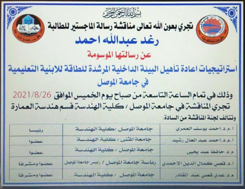 يتم بعونه تعالى في قسم هندسة العمارة في كلية الهندسة اجراء مناقشة رسالة الماجستير في اختصاص هندسة العمارة للطالبة (رغد عبدالله احمد) والموسومة ب (استراتيجيات اعادة تاهيل البيئة الداخلية المرشدة للطاقة للابنية التعليمية في جامعة الموصل) وذلك في تمام الساعة التاسعة صباحا من يوم الخميس الموافق (26/18/2021) في قاعة المناقشات في القسم.