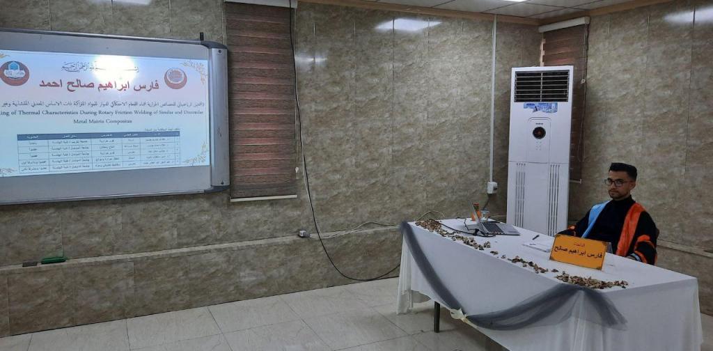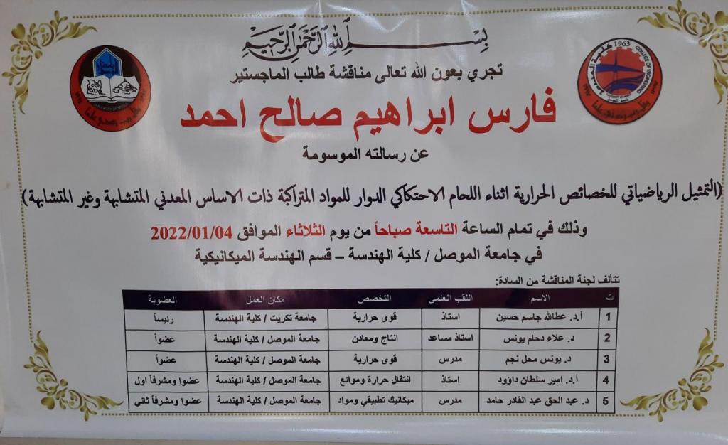 نوقشت رسالة ماجستير في قسم الهندسة الميكانيكية بجامعة الموصل بعنوان “التمثيل الرياضياتي للخصائص الحرارية أثناء اللحام الاحتكاكي الدوار للمواد المتراكبة ذات الأساس المعدني المتشابهة وغير المتشابهة” للطالب فارس ابراهيم صالح احمد في تمام الساعة التاسعة من يوم الثلاثاء الموافق 4/1/2022.