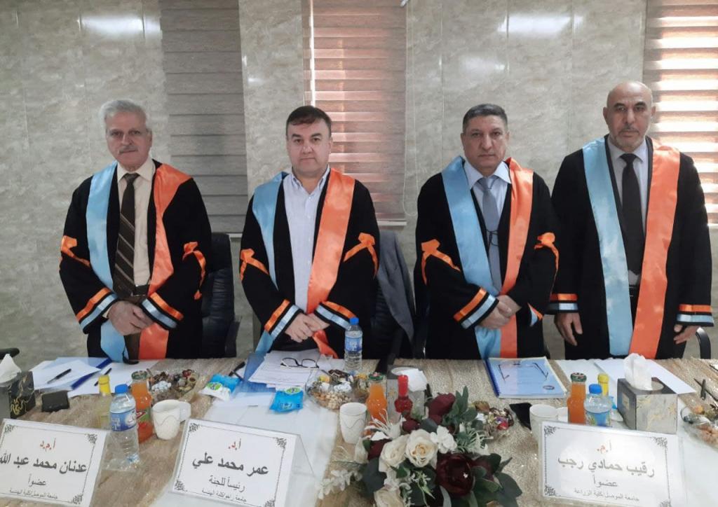 تالفت لجنة المناقشة من أ.د عمر محمد علي رئيسا وعضوية كل من أ.م.د عدنان محمد عبد الله الصفاوي وأ.م. رقيب حمادي رجب وا.م.د عبد الرحمن الحبو محمد عضوا ومشرفا وبعدها قرأ قرار لجنة المناقشة وتضمن قبول الرسالة مع منح الطالبة درجة الماجستير.