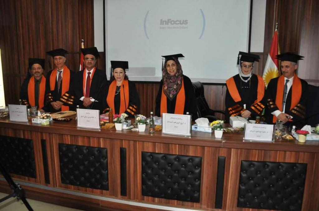 المناقشة جرت صباح يوم الخميس الموافق 2021/7/8 من قبل لجنة ترأسها الأستاذة الدكتورة غادە موسی رزوقي من جامعة بغداد وتضم في عضويتها كلاً من الأستاذ الدكتور هوشیار قادر رسول من جامعة السلیمانیە التقنیة والدكتور اریج كریم السدخان الاستاذ المساعد في جامعة اوروك الاهلیە والدكتورة نادیە عبد السلام مجید الاستاذة المساعدة في جامعة بغداد والدكتور حسن عبدالرزاق السنجري الأستاذ المساعد في جامعة الموصل والدكتور امجد محمد علي القرداغي الأستاذ المساعد في جامعة السلیمانیة … عضوا مشرفا