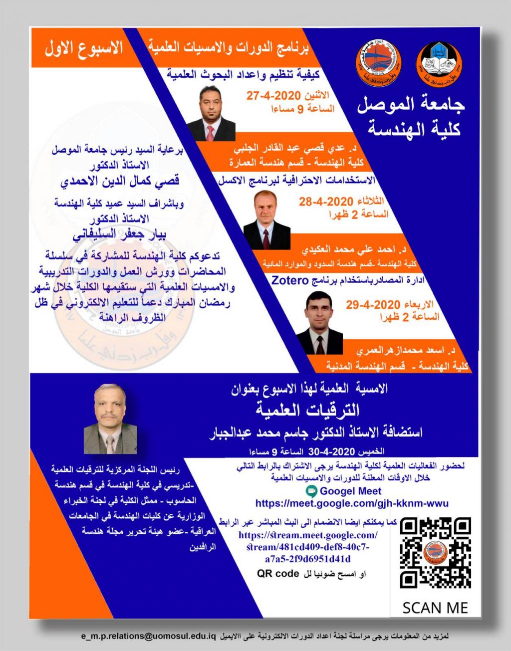 تقيم كلية الهندسة برعاية السيد رئيس جامعة الموصل أ.د. قصي كمال الدين الاحمدي وبدعم من السيد عميد كلية الهندسة أ.د. بيار جعفر السليفاني سلسلة من المحاضرات وورش العمل والدورات التدريبية وباستخدام البرنامج التفاعلي Meet. تأتي هذه الدورات دعماً للتعليم الالكتروني في ظل الظروف الراهنة. حيث سيتم إقامة: دورة تدريبية عن كيفية تنظيم واعداد البحوث العلمية يلقيها م.د.عدي قصي عبد القادر الجلبي في تمام الساعة 9:00 مساء من يوم الاثنين الموافق 27/4/2020. تتضمن الدورة التخطيط العام للبحث واختيار عنوان للبحث بصورة علمية وتنظيم كتابة اسم الباحث والانتماء واختيار الكلمات المفتاحية المناسبة وفن كتابة ملخص البحث ومراحل كتابة البحث العلمي ومقدمة البحث وتصميم منهجية التصميم والعلاقة بين النتائج ومناقشة النتائج الدراسات السابقة وفن كتابة الخلاصة والمصادر وادارتها ضمن البحث.