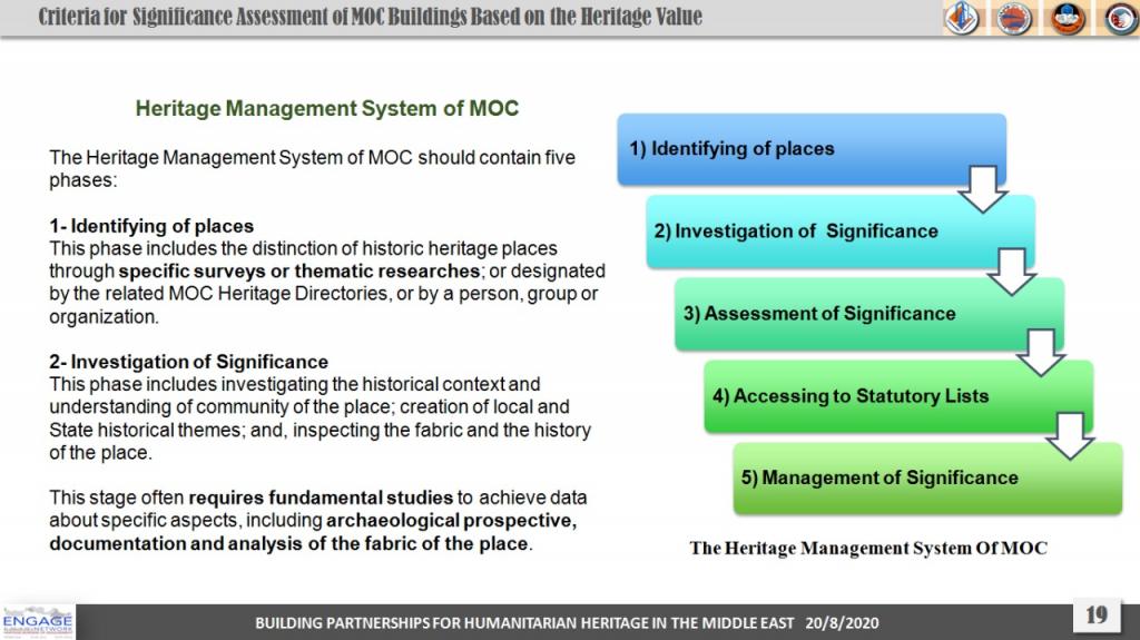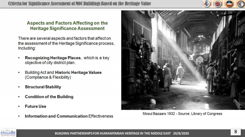 يوم الخميس الموافق 20/8/2020 والتي تم تنظيمها من قبل شبكة Heritage Borders of Engagement Network كإحدى حلقات البرنامج التشاركي مع عدد من الجامعات العالمية وبرعاية جامعات بريطانية وبحضور ممثل معالي السيد وزير التعليم العالي والبحث العلمي، والسيد وزير الثقافة والسياحة والآثار ورؤساء عدد من الجامعات العراقية والمختصين في حقل حماية التراث العمراني.