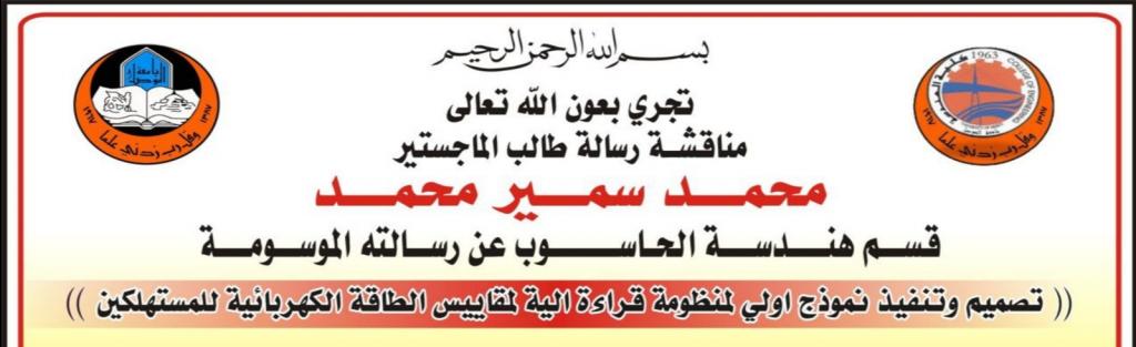 تم مناقشة رسالة ماجستير في قسم هندسة الحاسوب / كلية الهندسة بجامعة الموصل عن ( تصميم وتنفيذ نموذج أولي لمنظومة قراءة آلية لمقاييس الطاقة الكهربائية للمستهلكين ) للطالب محمد سمير محمد في تمام الساعة التاسعة من يوم الثلاثاء الموافق 2020/09/24 وعبر منصة كوكل مييت.