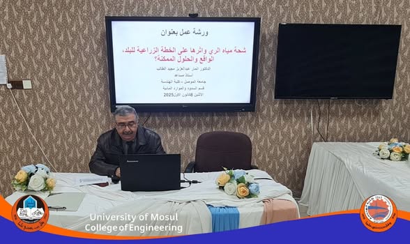ضمن النشاطات العلمية لقسم هندسة السدود والموارد المائية كلية الهندسة بجامعة الموصل وحرصها على تحقيق أهداف التنمية المستدامة، ولاسيما الهدف الرابع "التعليم الجيد" والهدف الحادي عشر "مدن ومجتمعات محلية مستدامة"، أقام قسم هندسة السدود والموارد المائية ورشة عمل بعنوان "شحة مياه الري واثرها على الخطة الزراعية للبلد، الواقع والحلول الممكنة " وذلك في يوم الاثنين الموافق 8 كانون الاول 2025 وعلى قاعة المناقشة في قسم هندسةالسدودوالمواردالمائية. حاضر في الورشة الأستاذ المساعد الدكتور انمارعبد العزيز الطالب. تناولت الورشة موضوع شحة مياه الري واثرها على الخطة الزراعية التي يتم اقرارها من قبل وزارة الزراعة بالتعاون مع وزارة الموارد المائية والتي تاثرت بشكل [إقرأ المزيد]