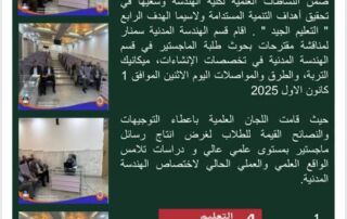 ضمن النشاطات العلمية لكلية الهندسة وسعيها في تحقيق أهداف التنمية المستدامة ولاسيما الهدف الرابع " التعليم الجيد " , أقام قسم الهندسة المدنية سمينار لمناقشة مقترحات بحوث طلبة الماجستير في قسم الهندسة المدنية في تخصصات الإنشاءات، ميكانيك التربة، والطرق والمواصلات اليوم الاثنين الموافق 1 كانون الاول 2025 . حيث قامت اللجان العلمية باعطاء التوجيهات والنصائح القيمة للطلاب لغرض انتاج رسائل ماجستير بمستوى علمي عالي ودراسات تلامس الواقع العلمي والعملي الحالي لاختصاص الهندسة المدنية.