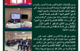 ضمن النشاطات العلمية لقسم هندسة السدود والموارد المائية / كلية الهندسة بجامعة الموصل وحرصها على تحقيق أهداف التنمية المستدامة، ولاسيما الهدف الرابع "التعليم الجيد"، أقام قسم هندسة السدود والموارد المائية ورشة عمل بعنوان "ارتشاح الماء في الترب ذات الكثافة الظاهرية المتغيرة مع العمق" وذلك في يوم الاثنين الموافق 1 كانون الاول 2025 وعلى قاعة المناقشة في قسم هندسةالسدودوالمواردالمائية. حاضر في الورشة المدرس الدكتور احمد علي العكيدي، حيث تناولت الورشة تقييم تاثير التربة ذات الكثافة الظاهرية المتغيرة مع العمق على ارتشاح الماء ونمذجة تاثير الكثافة الظاهرية المتغيرة مع عمق قطاع التربة من خلال اقتراحصيغ تجريبية معدلة تربط ارتشاح المياه بالعوامل المؤثرة [إقرأ المزيد]