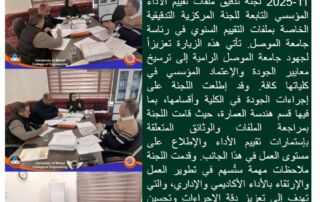 إستقبل قسم هندسة العمارة - كلية الهندسة – جامعة الموصل يوم الأحد المصادف 30-11-2025 لجنة تدقيق ملفات تقييم الأداء المؤسسي التابعة للجنة المركزية التدقيقية الخاصة بملفات التقييم السنوي في رئاسة جامعة الموصل. تأتي هذه الزيارة تعزيزاً لجهود جامعة الموصل الرامية إلى ترسيخ معايير الجودة والإعتماد المؤسسي في كلياتها كافة. وقد إطلعت اللجنة على إجراءات الجودة في الكلية وأقسامها، بما فيها قسم هندسة العمارة، حيث قامت اللجنة بمراجعة الملفات والوثائق المتعلقة بإستمارات تقييم الأداء والإطلاع على مستوى العمل في هذا الجانب. وقدمت اللجنة ملاحظات مهمة ستُسهم في تطوير العمل والإرتقاء بالأداء الأكاديمي والإداري، والتي تهدف إلى تعزيز دقة الإجراءات وتحسين الجودة.