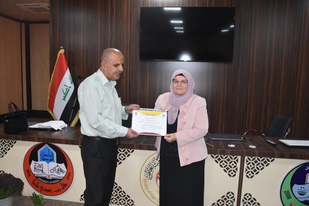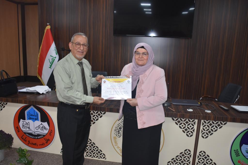 اختتمت اليوم الخميس 13 تشرين الاول 2022 اعمال الدورة التدريبية الموسومة ((تقنية زراعة الأنسجة النباتية وتطبيقاتها الماضي والحاضر المستقبل)) والتي استمرت على مدار ثلاثة ايام.شهد اليوم الختامي للدورة محاضرة عن انتاج النباتات المعدلة وراثيا بالاستفادة من تقنيات زراعة الانسجة النباتية القتها م.د.شيماء خليل الحيالي اوضحت فيها الخطوات العملية بالتفصيل عن الية تحديد واضافة صفة جديدة للمادة الوراثية للنباتات باستخدام الهندسة الوراثية للنباتات ، كما سلطت الضوء من خلالها على كيفية استخدام تقنية ال ( PCR ) في تحديد وجود الجينات المسؤولة عن الصفة المدروسة تلاها محاضرة وعبر الفضاء الالكتروني للاستاذ الدكتور خيون علي محسن /مركز ابحاث النخيل/ جامعة البصرة بعنوان : زراعة الانسجة النباتية وعلاقتها بالبيئة، قدم فيها شرح مفصل عن اهمية الجوانب العملية والتطبيقات لتقنية زراعة الانسجة النباتية وماتوفره من فوائد جمة في الحفاظ على البيئة ، إذ تعتبر هذه التقنية صديقة للبيئة لاسباب اشار اليها الدكتور في محاضرته ..حضر اختتام الدورة السيدة عميد الكلية الاستاذ المساعد الدكتورة يسرى مجيد الشاكر والسيد معاون العميد للشؤون العلمية الدكتور علي بشير عزيز والسادة رؤساء الاقسام ومجموعة من اساتذة الكلية وطلبتها بالاضافة الى حضور موظفي مديرية بيئة نينوى.في نهاية الدورة تم اجراء اختبار للسادة المشاركين بالدورة ووزعت السيد عميد الكلية الشهادات التقديرية للسادة المشاركين بالدورة وعبرت عن شكرها و امتنانها للسادة المحاضرين والقائمين على اعمال هذه الدورة العلمية التي تمت بنجاح متمنين للجميع المزيد من العطاء والتقدم.شعبة الاعلام والعلاقات العامة
