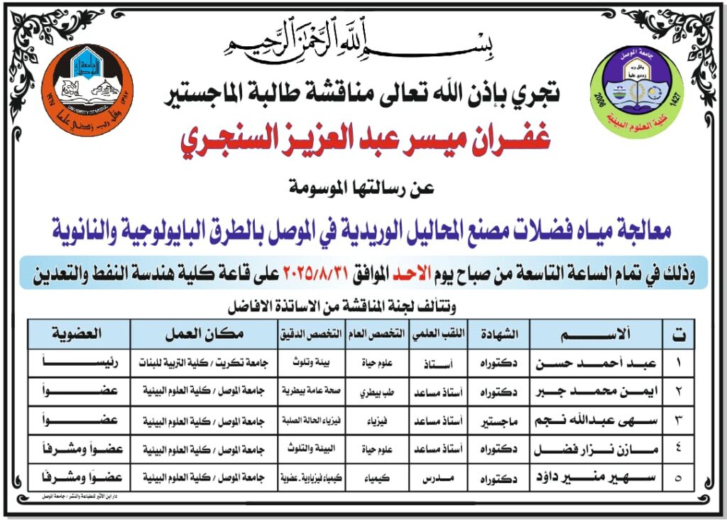 أعلان موعد مناقشة في كلية العلوم البيئية