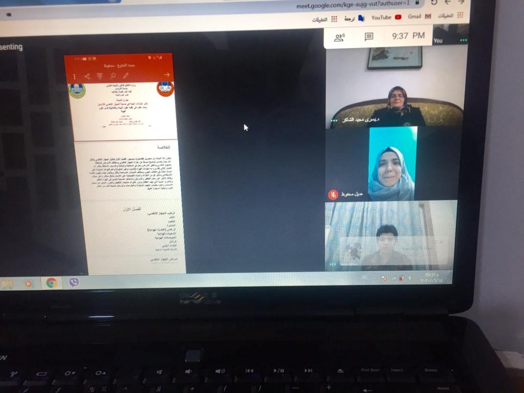 لتوجيهات السيد رئيس جامعة الموصل الاستاذ الدكتور قصي كمال الدين الاحمدي وباشراف مباشر من قبل السيدة عميد الكلية الاستاذ المساعد الدكتورة يسرى مجيد الشاكر تم في يوم الاثنين الموافق 15/6/2020 مناقشة بحث التخرج (تأثير ملوثات البيئة في صحة الجهاز التنفسي للانسان ) لطلبة المرحلة الرابعة من قبل لجنة المناقشة والمؤلفة من الاستاذ المساعد الدكتور يسرى مجيد شهاب الشاكر عميد كلية البيئة (رئيسا) والمدرس المساعد عمر ادريس صالح مقرر قسم علوم البيئة ( عضوا ) والاستاذ الدكتور ناهدة سعيد ( مشرفا) وجرت المناقشة بسلاسة من خلال استخدام المنصة الاليكترونية ( Meet) وكانت هنالك بعض الملاحظات القيمة التي اضافت الى البحث قيمة علمية .