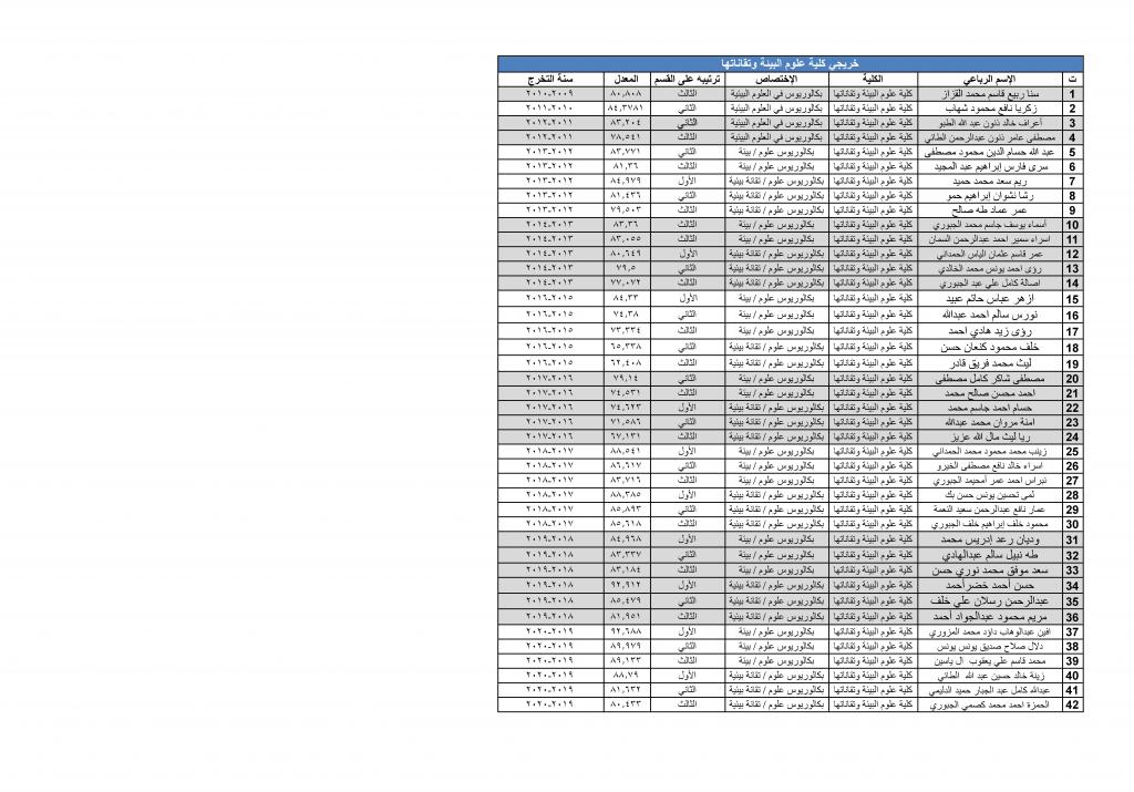 اعلان الى كافة الخريجين الثلاثة الاوائل على الاقسام العلمية في كليةعلوم البيئة وتقاناتها