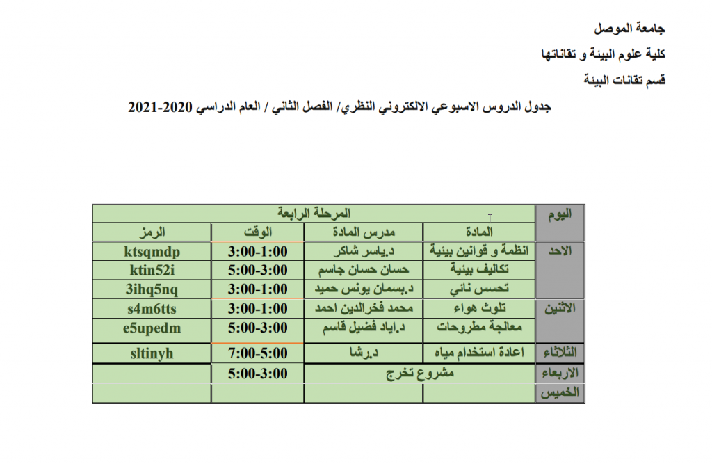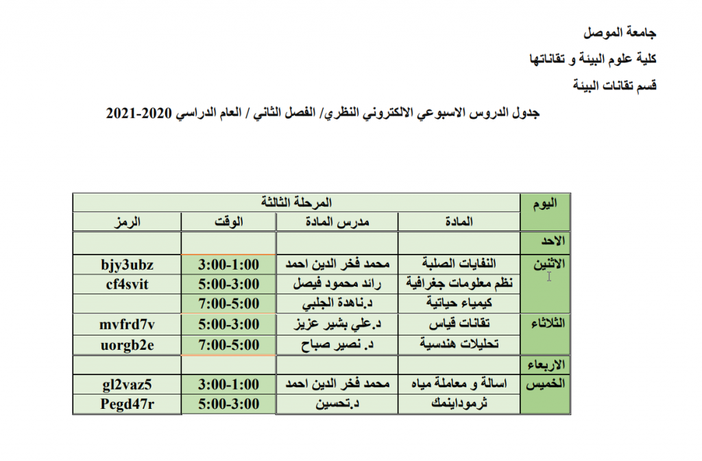 الى طلبتنا الاعزاء في كلية علوم البيئة تقاناتها/ قسم تقانات البيئة ادناه جدول الدروس العملي الاسبوعي / الفصل الثاني وكذلك جدول الدروس الاسبوعي الالكتروني النظري/ الفصل الثاني / للعام الدراسي 2020-2021 ولجميع المراحل. متمنين لطلبتنا الاعزاء الموفقية والنجاحشعبة الاعلام والعلاقات العامة
