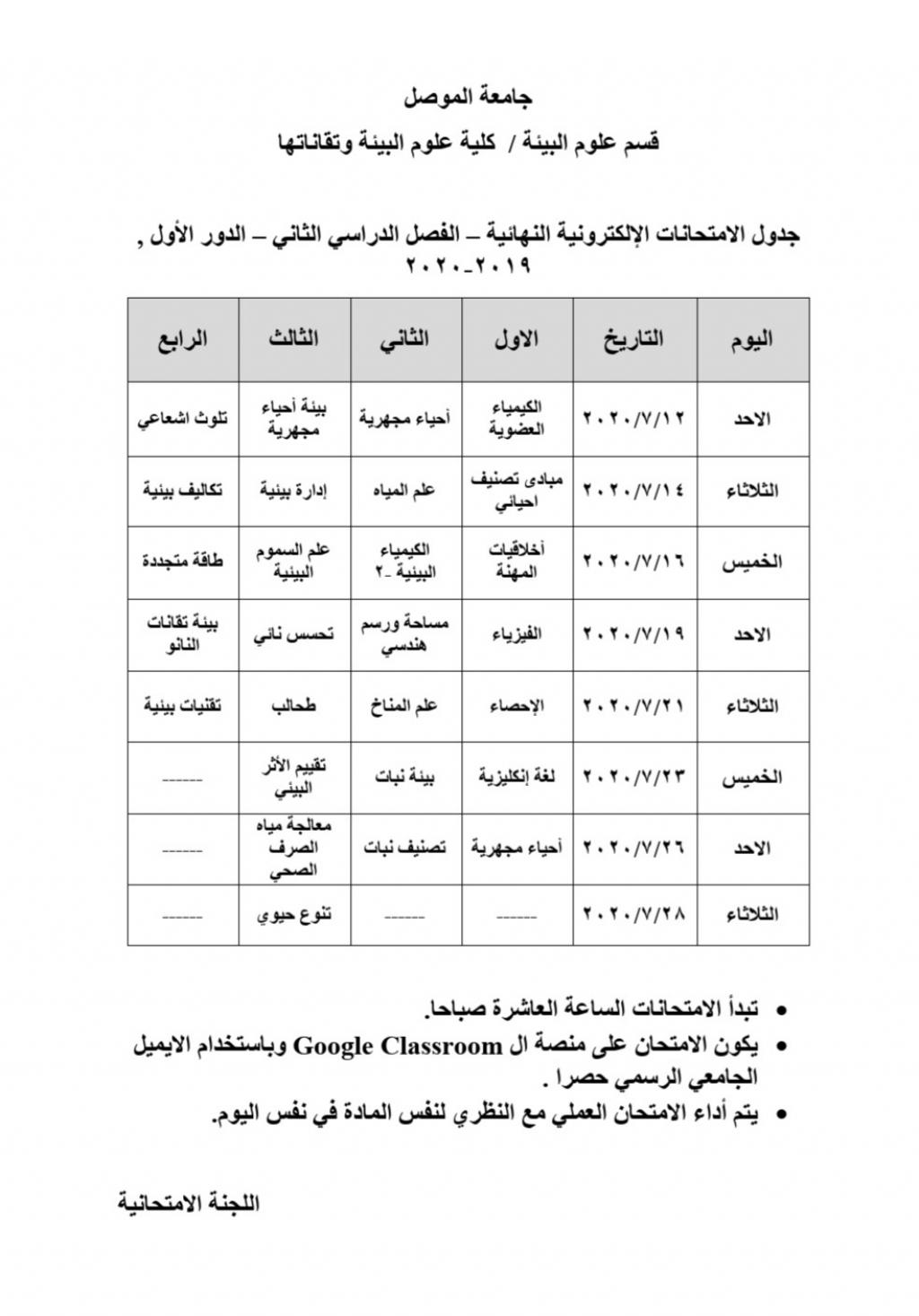 اعلان جدول الامتحانات النهائية للعام الدراسي ٢٠١٩-٢٠٢٠ لقسم علوم البيئة