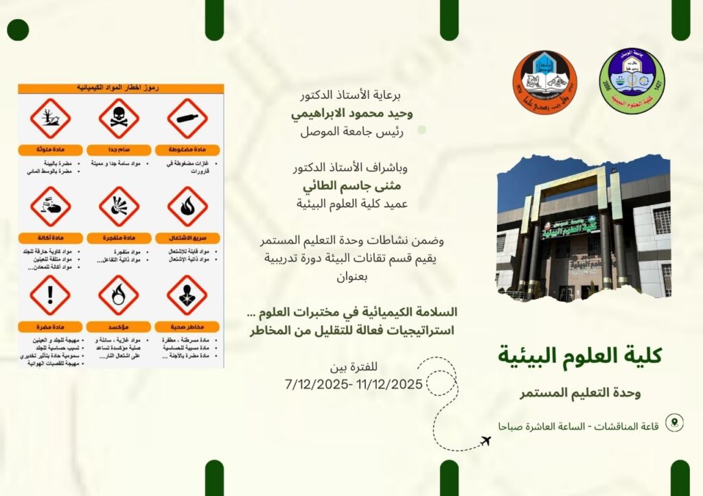 برعاية الاستاذ الدكتور وحيد محمود الابراهيمي رئيس جامعة الموصل واشراف السيد عميد كلية العلوم البيئية الاستاذ الدكتور مثنى جاسم الطائي ومتابعة السيد رئيس قسم تقانات البيئة الاستاذ المساعد الدكتور حازم جمعة محمود وضمن نشاطات وحدة التعليم المستمر للمساهمة في رفع وتطوير مهارات الكادر الوظيفي في دوائر الدولة، تقيم كلية العلوم البيئية/ قسم تقانات البيئة وبالتعاون مع رئاسة جامعة الموصل / قسم الدراسات والتخطيط / وحدة التنمية المستدامة دورة تدريبية بعنوان (السلامة الكيميائية في مختبرات العلوم … استراتيجيات فعالة للتقليل من المخاطر) ولمدة خمسة أيام للفترة من 7 كانون الأول ولغاية 11 كانون الأول 2025 في الساعة العاشرة صباحاً وعلى قاعة مناقشات الكلية.