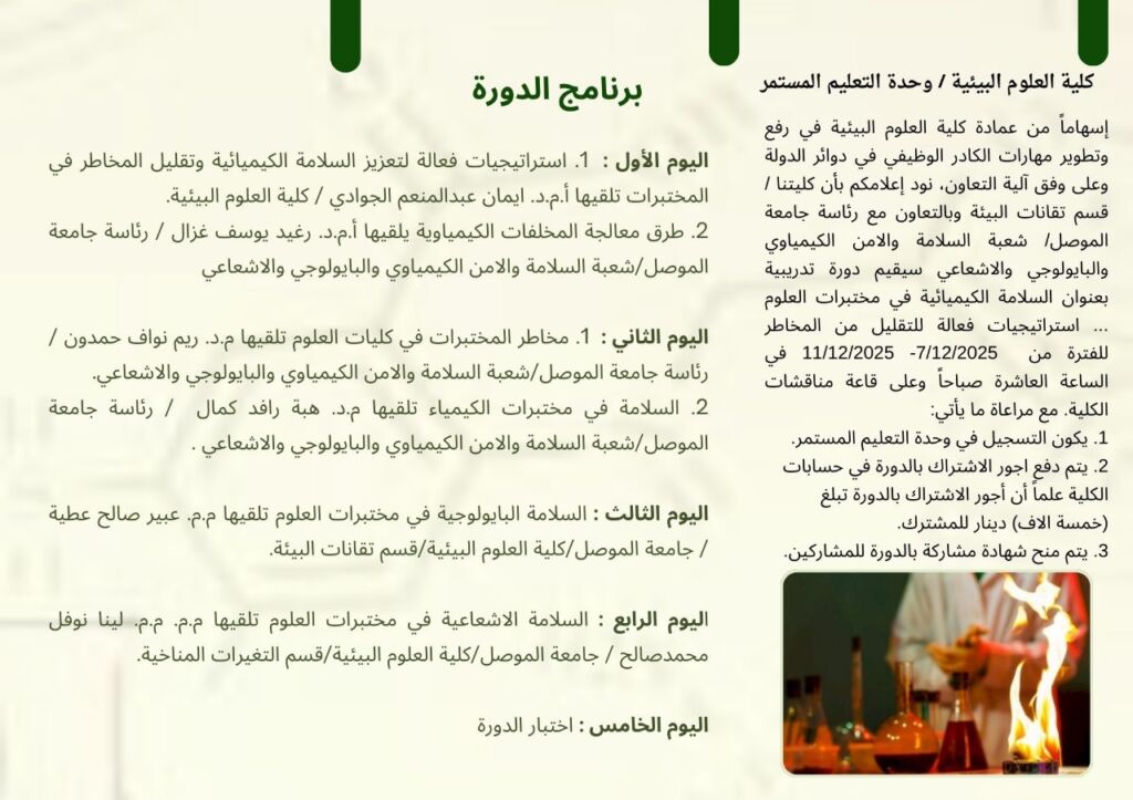 برعاية الاستاذ الدكتور وحيد محمود الابراهيمي رئيس جامعة الموصل واشراف السيد عميد كلية العلوم البيئية الاستاذ الدكتور مثنى جاسم الطائي ومتابعة السيد رئيس قسم تقانات البيئة الاستاذ المساعد الدكتور حازم جمعة محمود وضمن نشاطات وحدة التعليم المستمر للمساهمة في رفع وتطوير مهارات الكادر الوظيفي في دوائر الدولة، تقيم كلية العلوم البيئية/ قسم تقانات البيئة وبالتعاون مع رئاسة جامعة الموصل / قسم الدراسات والتخطيط / وحدة التنمية المستدامة دورة تدريبية بعنوان (السلامة الكيميائية في مختبرات العلوم … استراتيجيات فعالة للتقليل من المخاطر) ولمدة خمسة أيام للفترة من 7 كانون الأول ولغاية 11 كانون الأول 2025 في الساعة العاشرة صباحاً وعلى قاعة مناقشات الكلية.