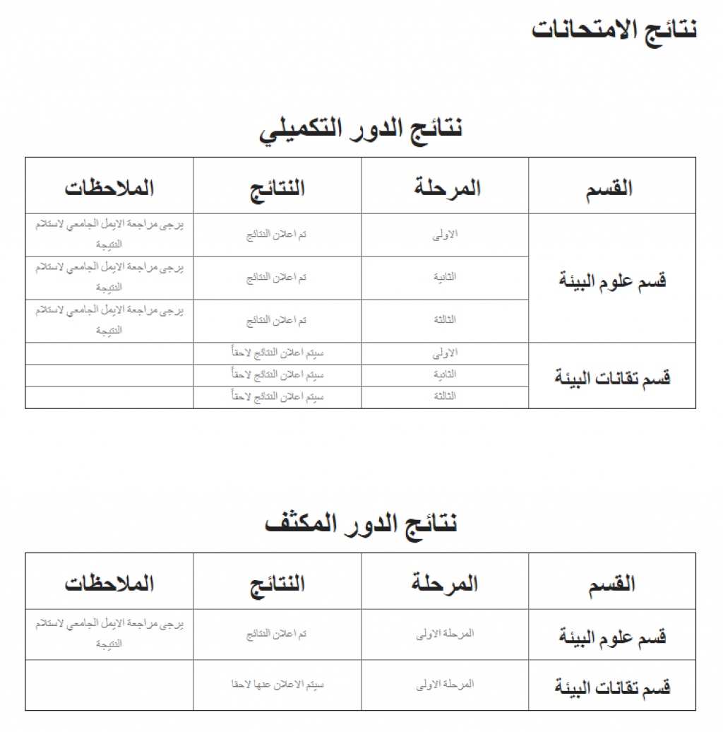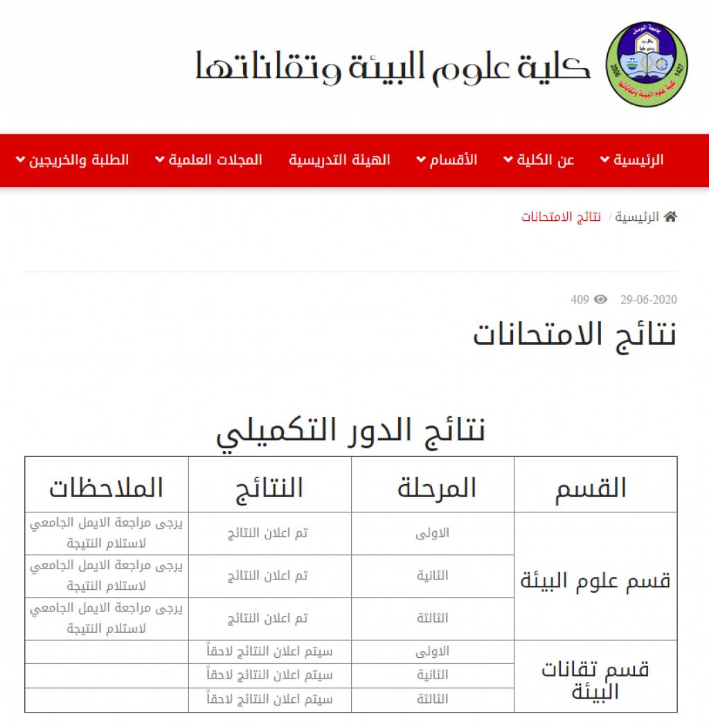 يرجى زيارة رابط موقع كلية علوم البيئة وتقاناتها/نتائج الامتحانات على الرابط التالي لمتابعة اعلان بقية النتائج