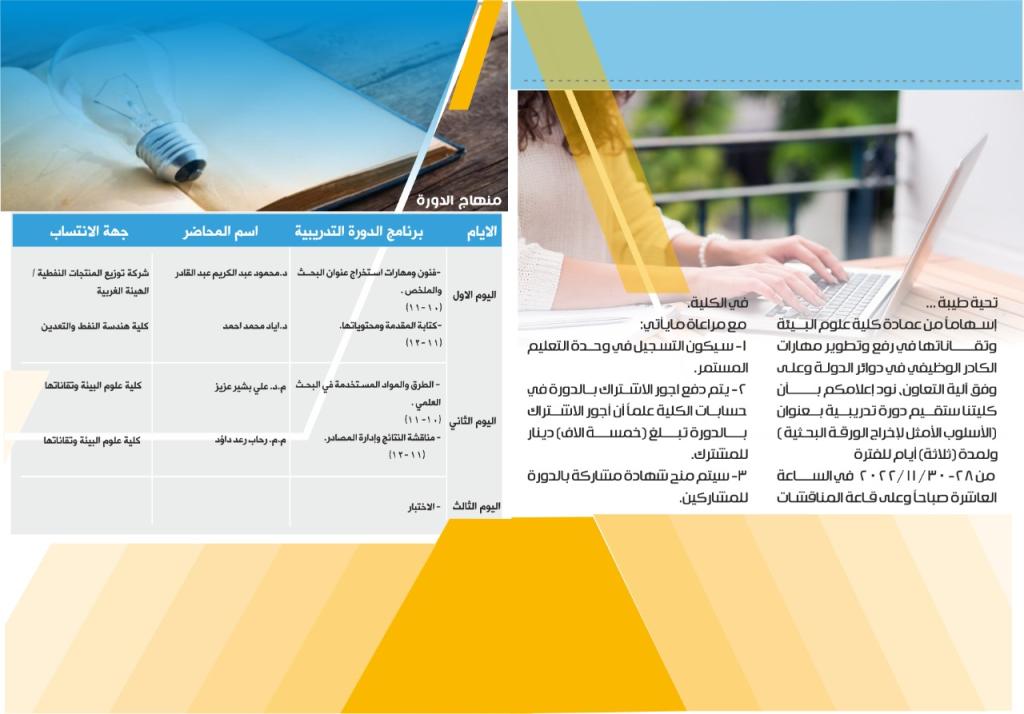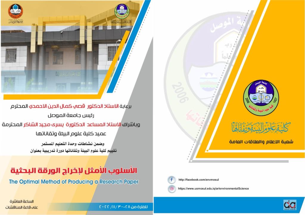 برعاية الاستاذ الدكتور قصي كمال الدين الاحمدي المحترمرئيس جامعة الموصل وباشراف الاستاذ المساعد الدكتورة يسرى مجيد الشاكر المحترمة عميد كلية علوم البيئة وتقاناتهاوضمن نشاطات وحدة التعليم المستمر تقييم كلية علوم البيئة وتقاناتها دورة تدريبية بعنوان:((الأسلوب الأمثل لإخراج الورقة البحثية))The Optimal Method of Producing a Research Paperوذلك في تمام الساعة العاشرة صباحاً على قاعة المناقشات في الكلية للفترة من ٢٨-٢٠٢٢/١١/٣٠.علما انه:ا – سيكون التسجيل في وحدة التعليم٢ – يتم دفع اجور الاشتراك بالدورة في حسابات الكلية علماً أن أجور الاشتراك بالدورة تبلغ (خمسة الاف دينار للمشترك).٣- سيتم منح شهادة مشاركة بالدورة.شعبة الاعلام والعلاقات العامة