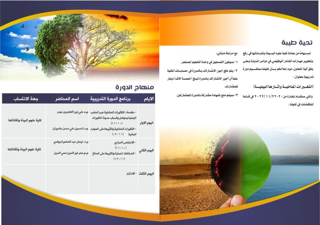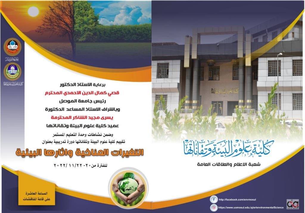 برعاية الأستاذ الدكتور قصي كمال الدين الأحمدي المحترم رئيس جامعة الموصل وباشراف الأستاذ المساعد الدكتورة يسرى مجيد الشناكر المحترمة عميد كلية علوم البيئة وتقاناتها وضمن نشاطات وحدة التعليم المستمر تقييم كلية علوم البيئة وتقاناتها دورة تدريبية بعنوان: