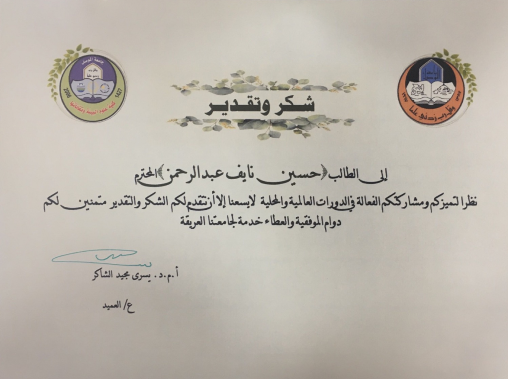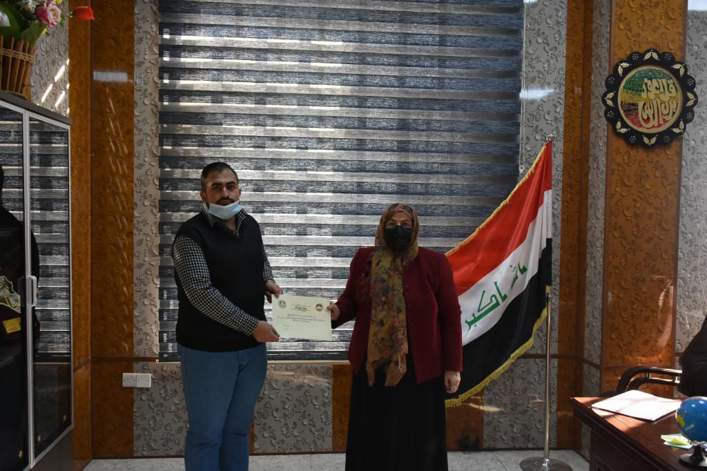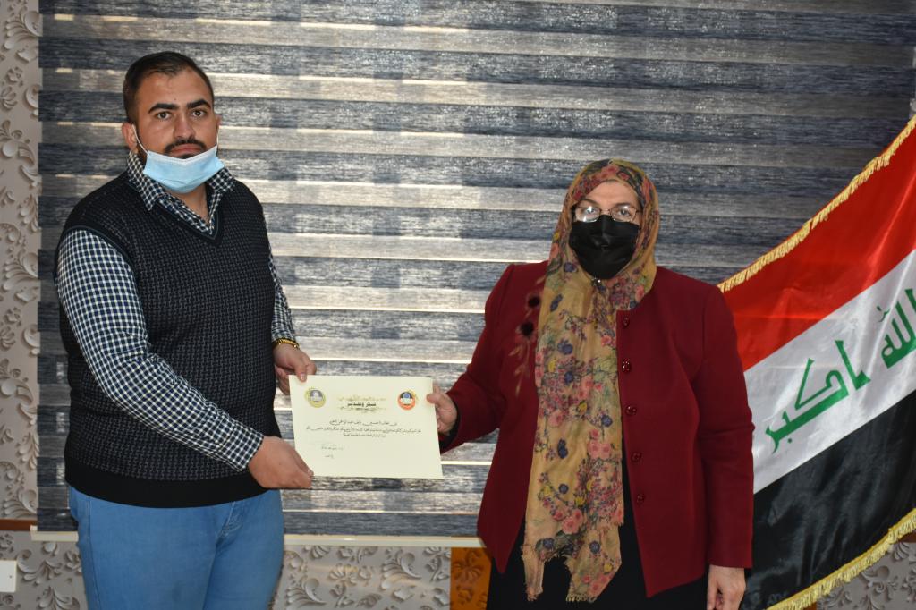 في اطار تحفيز الطلبة على الابداع والتعلم اهدت السيدة عميد كلية علوم البيئة وتقاناتها الاستاذ المساعد الدكتورة يسرى مجيد الشاكر كتاب شكر وتقدير للطالب حسين نايف عبد الرحمن نظرا لتميزه ومشاركته الفعالة في الدورات العلمية والمحلية. متمنين له دوام الموفقية والنجاح اعلام كلية علوم البيئة وتقاناتها