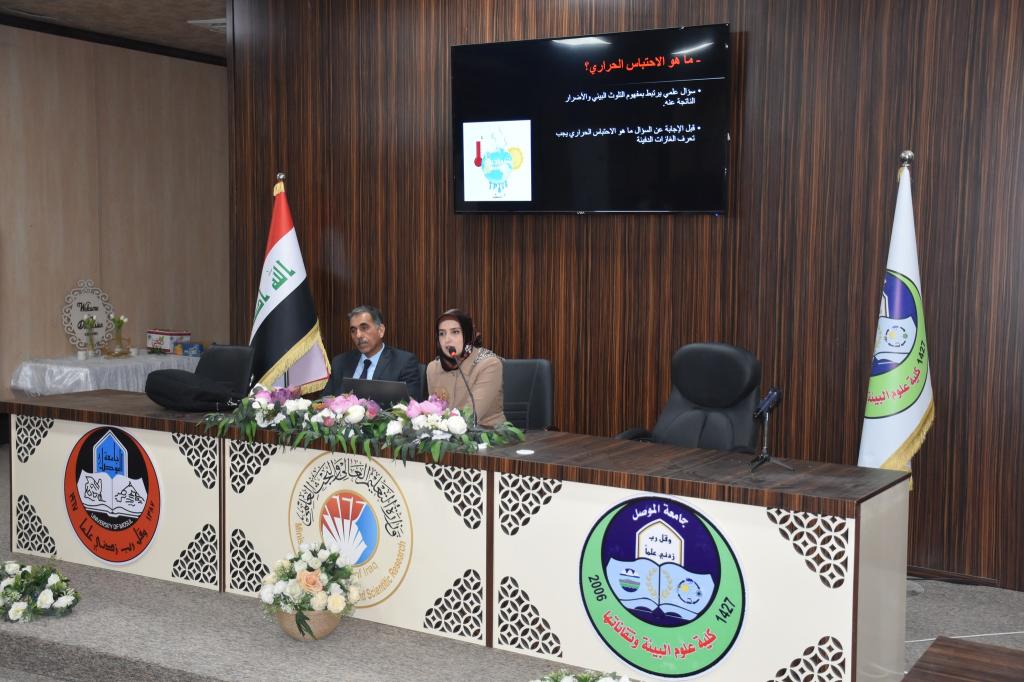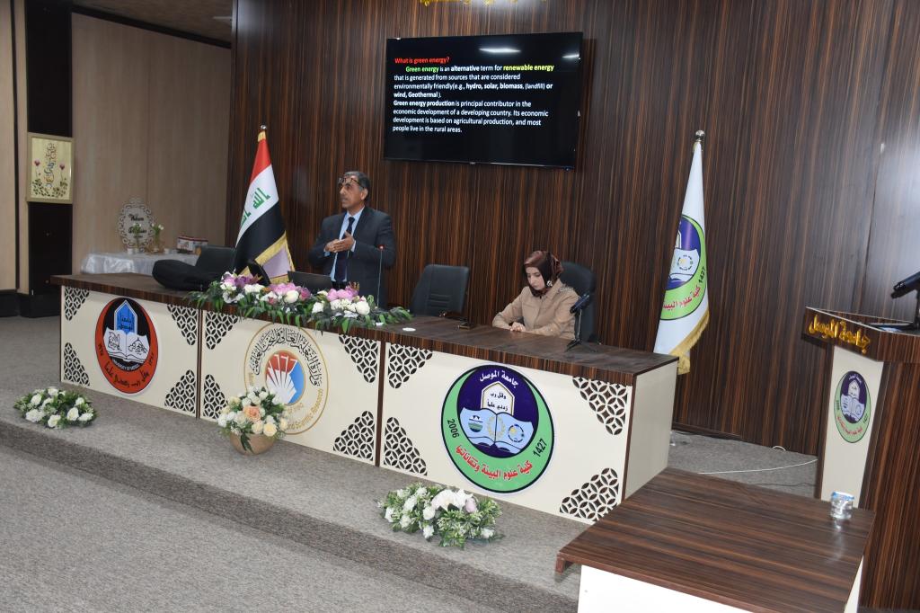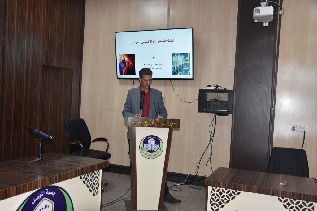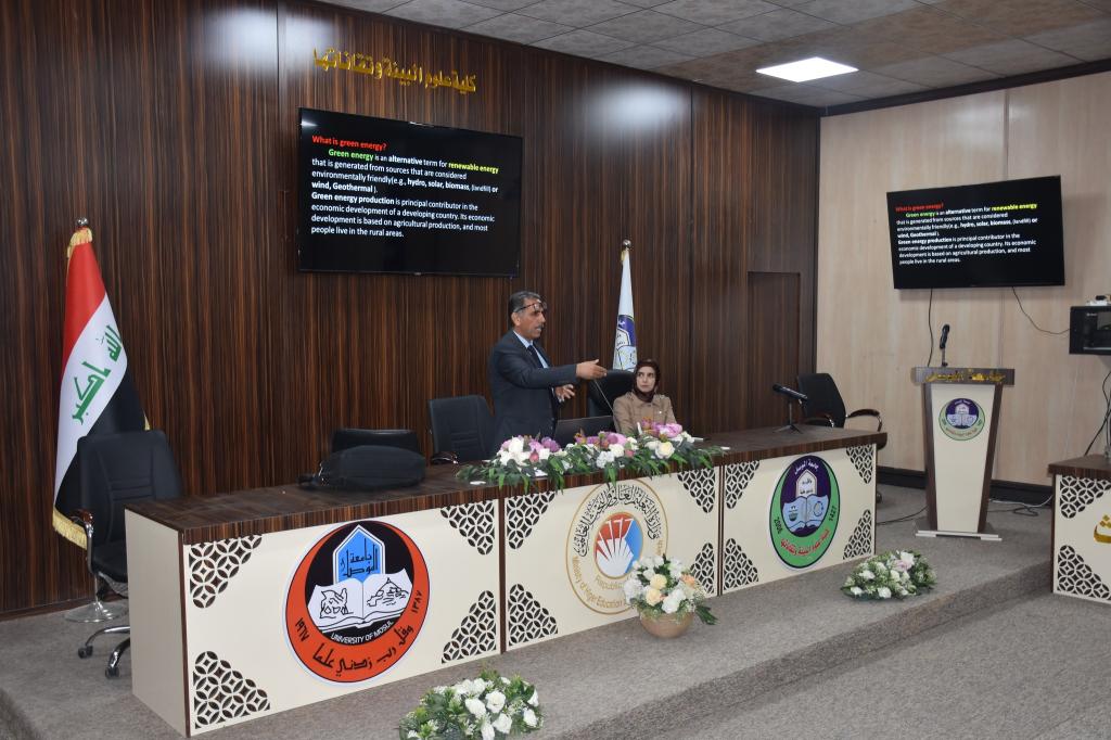باشراف الاستاذ المساعد الدكتورة يسرى مجيد الشاكر المحترمة عميد كلية علوم البيئة وتقاناتها اقامت كليتنا اليوم الاربعاء 16 تشرين الثاني 2022 الورشة التدريبية الموسومة ((الطاقة الخضراء والاحتباس الحراري)).القى خلالها كلا من الدكتور حامد عبد الله صالح و المدرس المساعد سهى سعد علي محاضرة عن ماهيه الاحتباس الحراري والغازات الدفيئة المتواجدة في الغلاف الجوي واضرار الاحتباس الحراري كما تم التطرق الى مفهوم الطاقة الخضراء والطاقة المتجددة وتعريف الكتلة الحيوية والطرق المختلفة التي ممكن اتباعها لتحويل الكتلة الحيوية إلى طاقة ممكن استخدامها كبديل لطاقة الوقود الاحفوري.وفي ختام الورشة استقبلت السيدة عميد الكلية الدكتور حامد عبد الله صالح في مكتبها الخاص واهدته شهادة تقديرية تثميناً لجهوده الفاعلة في القاء محاضرة في ورشة العمل التي اقامتها كليتنا. متمنين له المزيد من العطاء والتقدم.شعبة الاعلام والعلاقات العامة