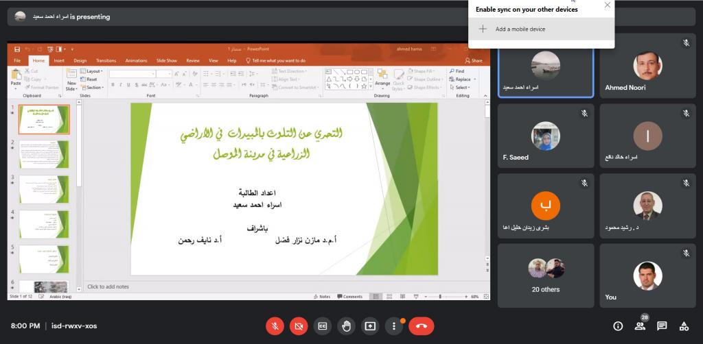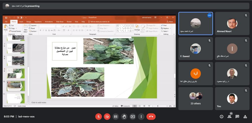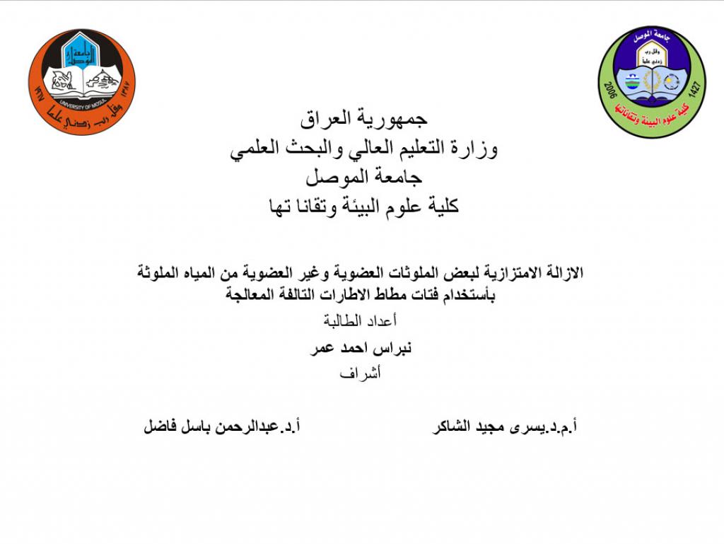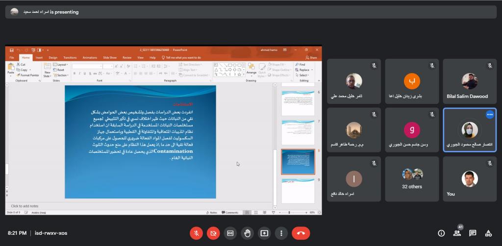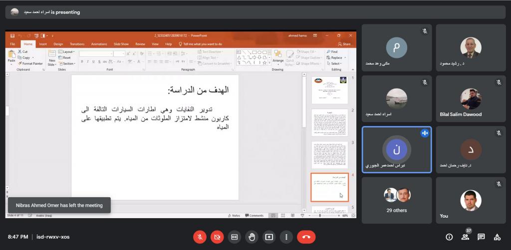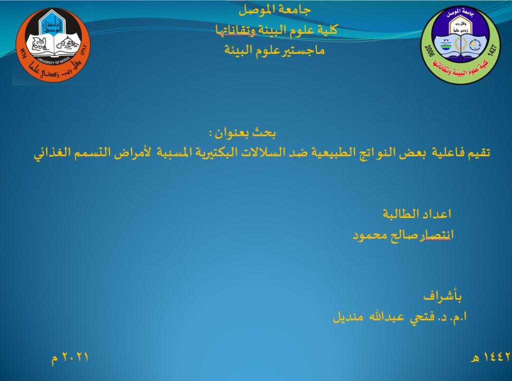 القى طلبة الماجستر في قسم علوم البيئة اليوم الثلاثاء 16 تشرين الثاني 2021 سمنار لبحوث الماجستير في مرحلة البحث وبحضور السيد رئيس قسم علوم البيئة واساتذة القسم.حيث القت الطالبة ((اسراء احمد سعيد)) سيمنار بعنوان “التحري عن التلوث بالمبيدات في الاراضي الزراعية في مدينة الموصل” تناولت فيه استخدام الكيمياويات في الزراعة لتحقيق الزيادة المطلوبة في الانتاج الزراعي لمواكبة الزيادة الحاصلة في سكان العالم بالاضافة الى المبيدات والتي تعتبر أهم وأخطر الملوثات البيئية ، بالإضافة إلى خطورتها على صحة الإنسان والحيوان. هدف البحث الى معرفة المبيدات شائعة الاستخدام في المزارع و مطابقة الاستخدامات لمحددات والمعايير العالمية وتقدير مستوى تراكيز المبيدات في التربة الزراعية. كما القت الطالبة((انتصار صالح محمود)) سمينار بعنوان “تقيم فاعلية بعض النواتج الطبيعية ضد السلالات البكتيرية المسببة لأمراض التسمم الغذائي” تناولت فيه فصل واستخلاص المركبات الفعالة من النباتات المائية او نباتات اخرى باستخدام المذيبات العضوية باستخدام اجهزة الفصل مثل ال HCL وعمود الفصل الكرومات وغرافي وجهاز كليفنجر”. وفي الختام القى الطالبة ((نبراس احمد عمر)) سمينار بعنوان “الازالة الامتزازية لبعض الملوثات العضوية وغير العضوية من المياه الملوثة بأستخدام فتات مطاط الاطارات التالفة المعالجة” تناولت فيه تدوير النفايات وهي اطارات السيارات التالفة الى كاربون منشط لامتزاز الملوثات من المياه. يتم تطبيقها على المياه. واستمع الطلبة الى تعليقات ونصائح الاساتذة الحاضرين التي اغنت الاجتماع بالمعلومات القيمة التي استفاد منها الطلبة في هذه المرحلة.شعبة الاعلام والعلاقات العامة