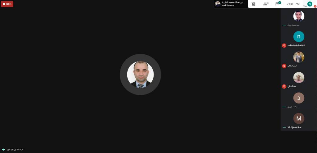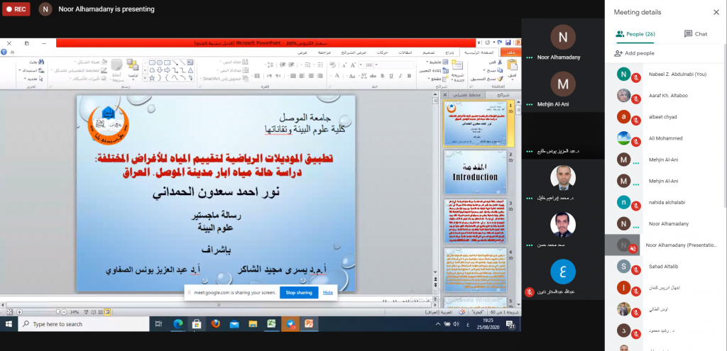 ضمن النشاطات العلمية لكلية علوم البيئة وتقاناتها/ قسم علوم البيئة .. تم عصر اليوم الثلاثاء الموافق 2020/8/25 القاء سمينار إلكتروني من قبل طالبة الماجستير نور احمد سعدون الحمداني بعنوان( تطبيق الموديلات الرياضية لتقييم المياه للاغراض المختلفة: دراسىة حالة مياه ابار مدينة الموصل ) .و قد حضر السمينار السيدة عميد الكلية الاستاذ المساعد الدكتورة يسرى مجيد الشاكر والسيد رئيس قسم علوم البيئة الاستاذ المساعد الدكتور محمد ابراهيم خليل و مجموعة من أساتذة القسم المحترمون.تناول السيمنار دراسة مياه ابار اربعة احياء في الجانب الايسر من مدينة الموصلهدف السمينار الى دراسة الخصائص النوعية للمياه الجوفية لابار احياء مدينة الموصل.تم خلال السمينار مناقشة بعض الفقرات العلمية مع الطالبة مع طرح مجموعة من الأسئلة التي من شأنها أن تغني الرسالة من الناحية العلمية .