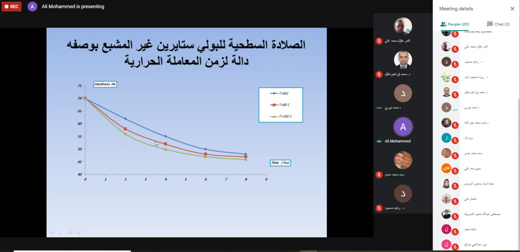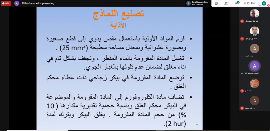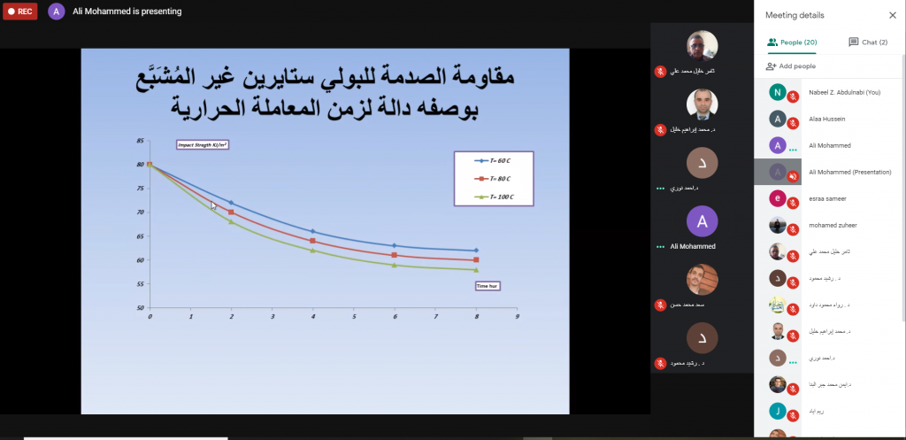 جرى مساء اليوم الاحد الموافق 6/9/2020 وعبر الفضاء الالكتروني القاء سمينار من قبل طالب الماجستير علي محمد احمد عن رسالته الموسومة”دراسة تاثير بعض العوامل الفيزيائية على تركيبة المواد البوليمرية واستخدامها لغرض حل مشكلة النفايات الصلبة”وقد حضر السيمنار السادة معاون العميد للشؤون العلمية والسيد رئيس قسم علوم البيئة واعضاء الهيئة التدريسية وطلبة الماجستير.تناولت البحث دراسة العوامل الفيزيائية التي تؤثر على تركيبة المواد البوليمرية واستخدامها في حل مشكلة النفايات الصلبة.هدفت الدراسة الى ايجاد طريقة لمعالجة النفايات البلاستيكية الصلبة باستخدام مؤثرات او محفزات فيزيائية.