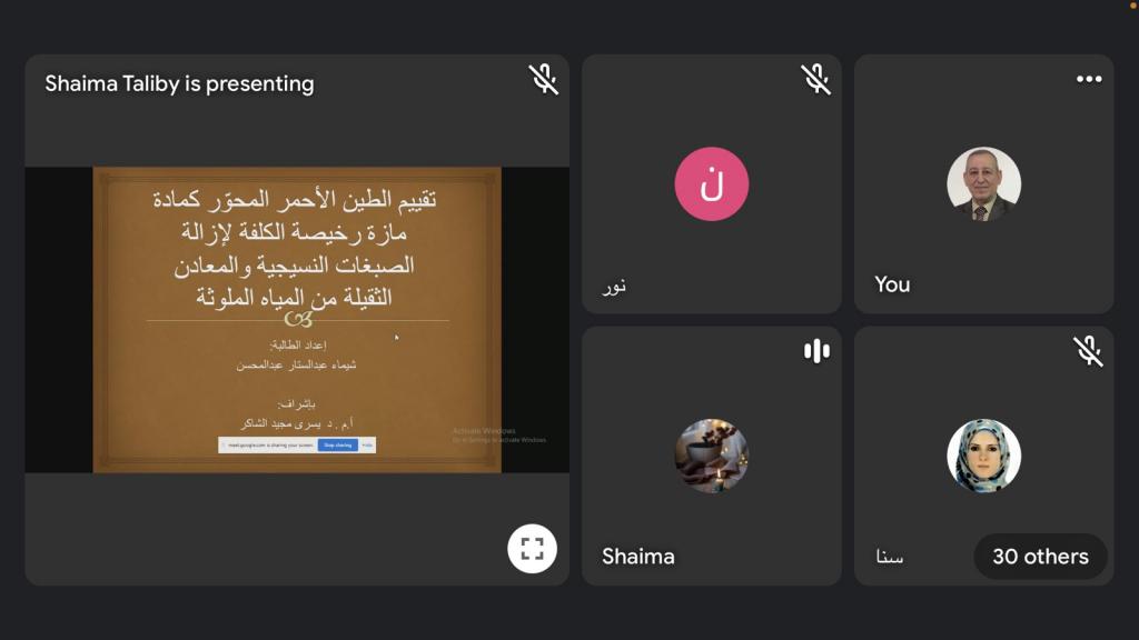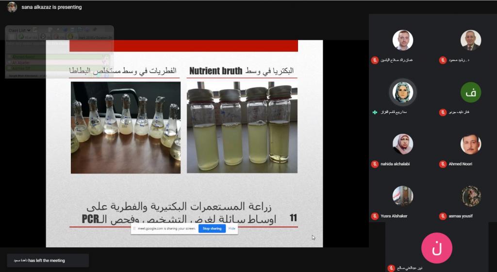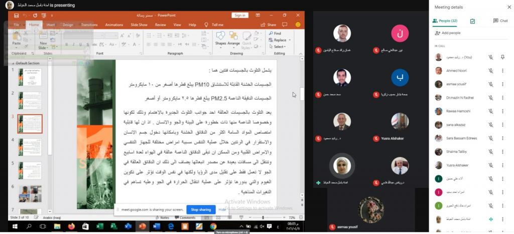 ضمن اطار النشاطات العلمية لقسم علوم البيئة تم اليوم الأحد ١١ نيسان 2021 إلقاء سيمنارات من قبل طلبة الدراسات العليا وهم كل من الطالبة أمنه باسل محمد عن بحثها الموسوم “دراسة نوعية لتلوث الهواء في مناطق مختارة من مدينة الموصل باشراف الاستاذ المساعد الدكتور رياض عبدالله فتحي والاستاذ المساعد الدكتور صباح حسين علي, والطالبة سنا ربيع قاسم عن بحثها الموسوم “دراسة العلاقة بين التلوث بالمعادن الثقيلة ومقاومة المضادات الحيوية لبعض الكائنات في بيئات مختلفة” باشراف كل من الاستاذ المساعد الدكتور مازن نزار فضل و الاستاذ المساعد الدكتور محمد إبراهيم خليل, والطالبة شيماء عبدالستار عبدالمحسن عن بحثها الموسوم “تقييم الطين الأحمر المحور كمادة مازة رخيصة الكلفة لإزالة الصبغات النسيجة والمعادن الثقيلة من المياه الملوثة بإشراف الاستاذ المساعد الدكتورة يسرى مجيد الشاكر.
