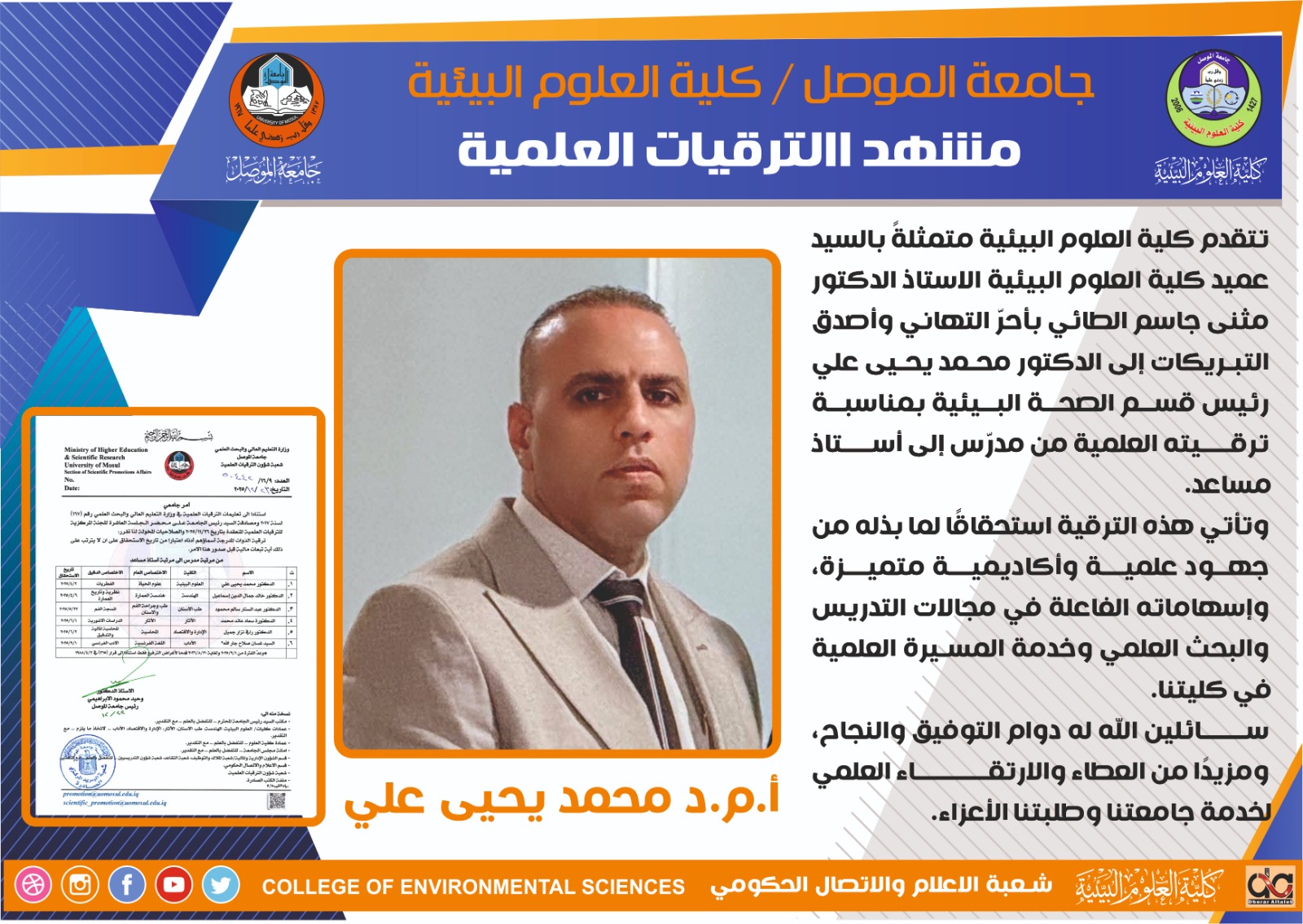 تتقدم عمادة كلية العلوم البيئية بأسمى آيات التهاني والتبريكات إلى الدكتور محمد يحيى علي , بمناسبة ترقيته العلمية من مرتبة مدرس إلى مرتبة أستاذ مساعد [إقرأ المزيد]