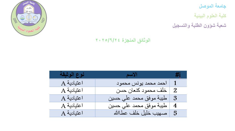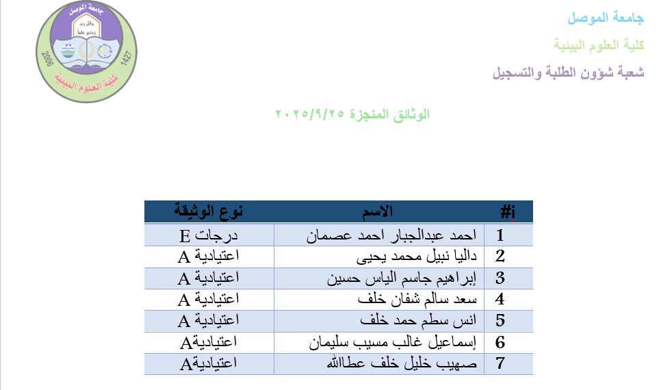 انجزت الوثائق في شعبة الطلبة والتسجيل كما موضح في الجدول ادناه شعبة الاعلام والاتصال الحكومي كلية العلوم البيئية 24 أيلول 2025
