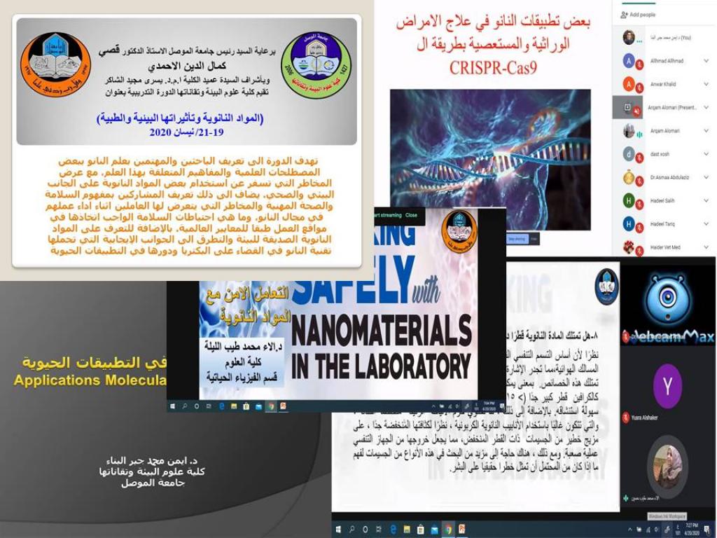 استناداً الى توجيهات السيد رئيس الجامعة ا.د. قصي كمال الدين الاحمدي بضرورة التواصل العلمي والانفتاح على المجتمع وباشراف مباشر من السيدة عميد كلية علوم البيئة وتقاناتها ا.م.د. يسرى مجيد الشاكر, انتهت اليوم الثلاثاء المصادف 21/4/ 2020 اعمال الدورة الموسومة ( المواد النانوية وتاثيراتها البيئة والطبية ) التي امدت على فترة ثلاثة ايام وبمشاركة اكثر من 1500 من الاكاديمين والمختصين من مختلف الجامعات العراقية والعربية , وياتي هذا النشاط العلمي ضمن سلسلة من انشطة الكلية وادامة التواصل وتبادل الخبرات والاراء العلمية من خلال المنصات الالكترونية .
