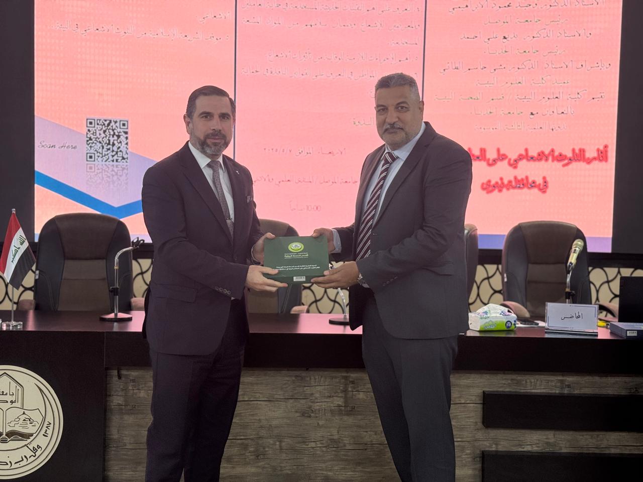 برعايــة الأستــاذ الدكتــور وحيد محمود الابراهيمي رئيس جامعــة الموصل وبإشراف وحضور الأستاذ الدكتور مثنى جاسم محمد الطائي عميد كلية العلوم البيئية، اقامت كلية العلوم البيئية/ قسم الصحة البيئية الندوة العلمية الثالثة الموسومة “اثار التلوث الاشعاعي على العناصر البيئية” صباح اليوم الاربعاء الموافق ٧ ايار ٢٠٢٥ ، بالتعاون مع جامعة الحدباء. حضرها الدكتور رياض عبدالله الطائي مساعد رئيس جامعة الحدباء للشؤون العلمية والاستاذ المساعد الدكتور باسل خلف محمود رئيس نقابة الاكاديميين وشخصيات اكاديمية بارزة من مختلف الجامعات وجمعٌ غفير من الباحثين والطلبة.