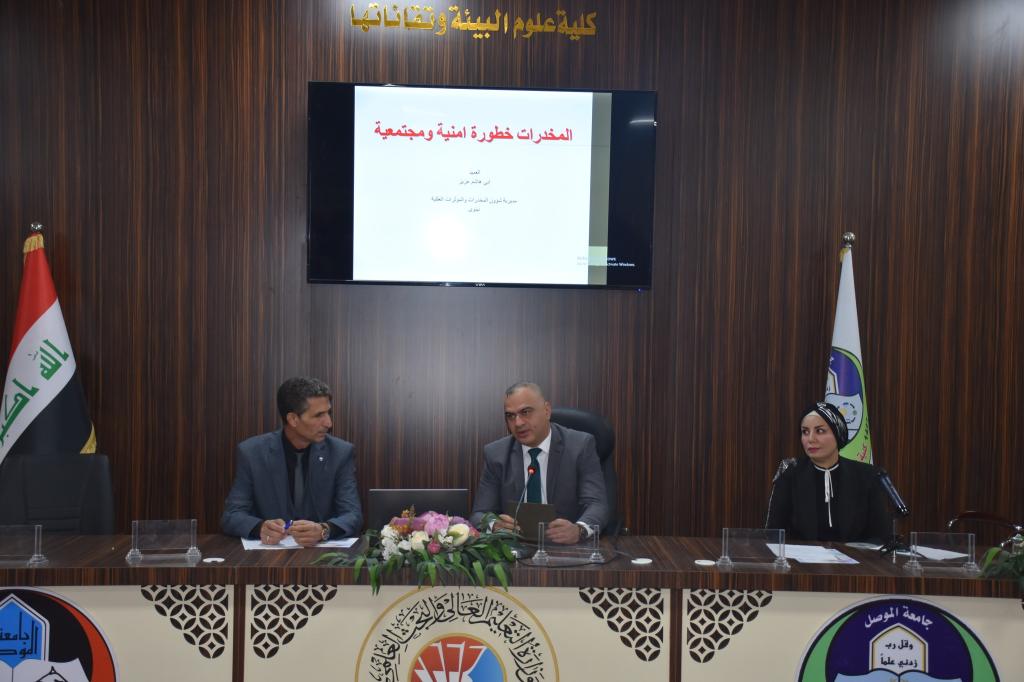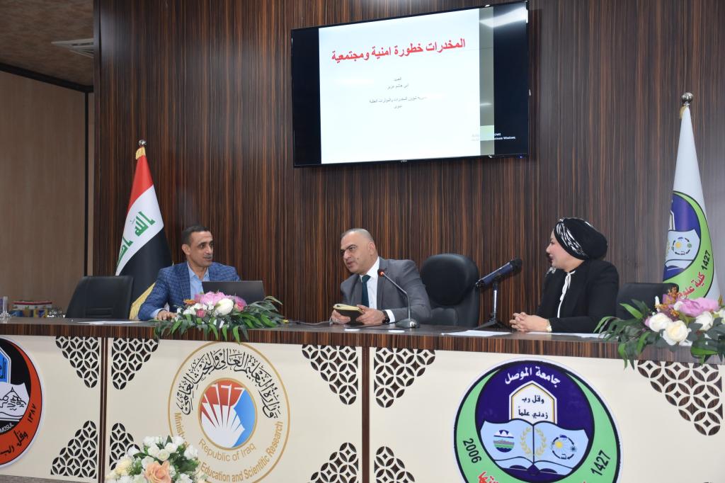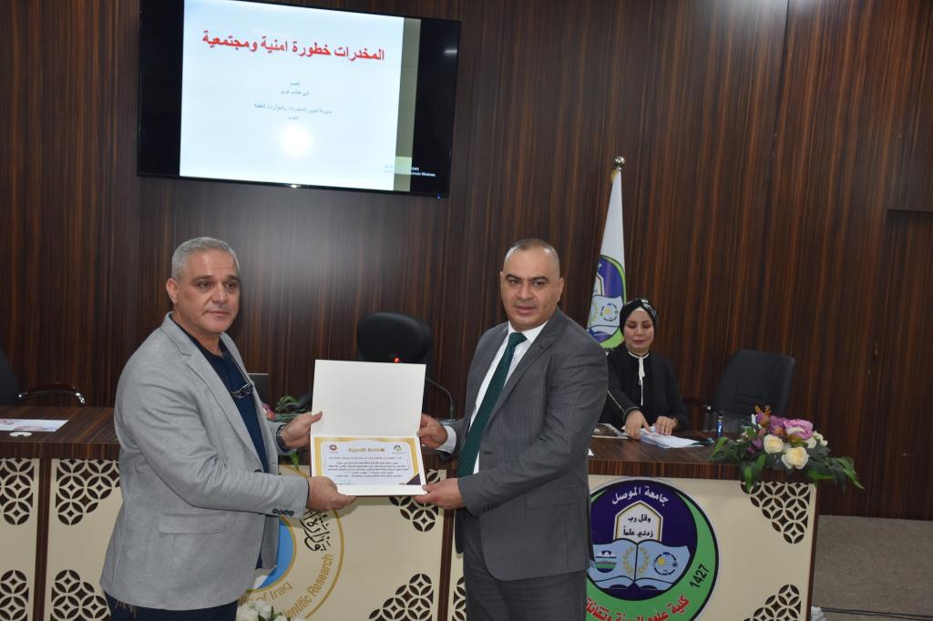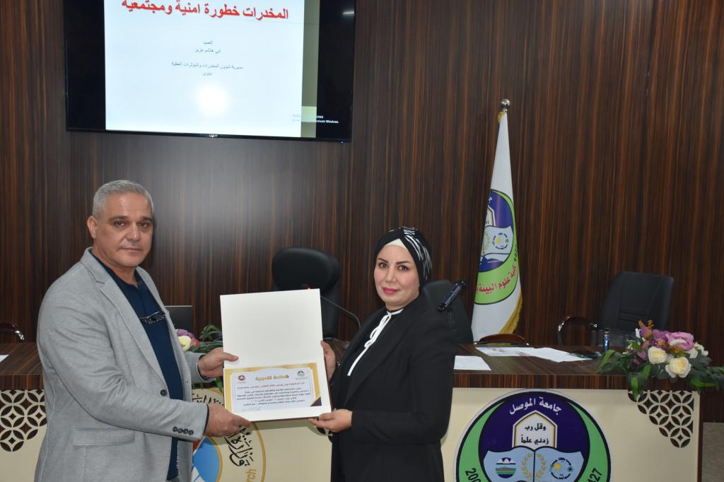 بإشراف مباشر من لدن السيدة عميد كلية علوم البيئة وتقاناتها الأستاذ المساعد الدكتورة يسرى مجيد الشاكر ومتابعة حثيثة من قبل السيد معاون العميد للشؤون العلمية الدكتور علي بشير عزيز انطلقت صباح اليوم الاحد 13 تشرين الثاني 2022 اعمال الدورة التدريبية الموسومة (( الادمان أضراره ومخاطره على المجتمع والبيئة )) في يومها الاول والتي تستمر على مدار ثلاثة ايام للفترة من 13-15 تشرين الثاني 2022.القت خلالها الدكتورة ليلى يونس صالح المولى محاضرة بعنوان ” الادمان الالكتروني وتأثيره على المجتمع فيما القى العميد ابي هاشم عزيز /مديرية شؤون المخدرات والمؤثرات العقلية/نينوى محاضرة بعنوان ” الادمان خطورة امنية ومجتمعية” تطرقوا من خلالها الى خطر الادمان وأثاره التي تهدد أسرنا وشبابنا وتنذر بانهيارها, حيث تعتبر المخدرات بكافة أشكالها وأنواعها من أخطر الآفات الاجتماعية التي تعصف بمجتمعاتنا لما لها من آثار سلبية جسيمة على كل من الفرد والأسرة والمجتمع. وسنكون غدا على موعد مع اليوم الثاني للدورة حيث ستلقي الدكتورة ريم نواف حمدون /مديرية تربية نينوى محاضرة بعنوان ادمان المخدرات وكيفية معالجتها.حضر الدورة السيدة معاون العميد للشؤون الادارية والسادة رؤساء الاقسام وعدد من اساتذة وطلبة الكلية.وفي ختام اليوم الاول للدورة اهدى السيد معاون العميد للشؤون العلمية شهادات تقديرية للسادة المحاضرين بالدورة. متمنين لهم المزيد من العطاء.شعبة الاعلام والعلاقات العامة