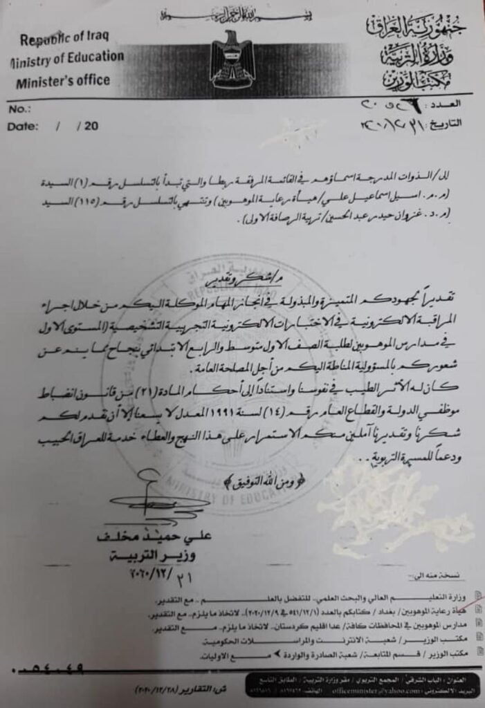 تدريسي في كلية علوم البيئة وتقاناتها يحصل على كتاب شكر وتقدير من السيد وزير التربية