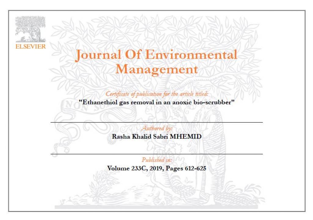 ضمن اطار النشاطات العلمية لكلية علوم البيئة وتقاناتها حصلت الدكتوره رشا خالد صبري التدريسية في قسم تقانات البيئة على شهادة جدارية من دار النشر العالمية Elsevier كونها نشرت بحثاً علمياً في مجلة علمية رصينة Journal of Environmental Management وهي احدى المجلات التابعة لدار النشر Elsevier وتصنيف المجلة Q1. في بحثها الموسوم Ethanethiol gas removal in an anoxic bio-scrubberمتمنين لها دوام الموفقية والنجاح